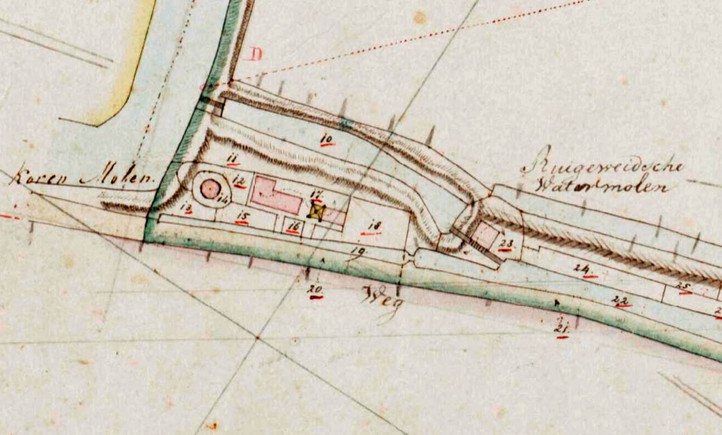 Dichtbij de Ruige Weidsche Watermolen (Tenbruggencatenummer 00098 a) stond ook nog een stenen grondzeiler-korenmolen, aan de Poppelendam, onder Hogebrug.*Op 2 juli 1660 werd voor de erfpachtsom van 3 pond een windbrief (het recht om een molen te mogen bouwen en exploiteren) voor een korenmolen in de Heerlijkheid van Heeckendorp verstrekt aan Johan Olij van Velsen, Heer van Heeckendorp.