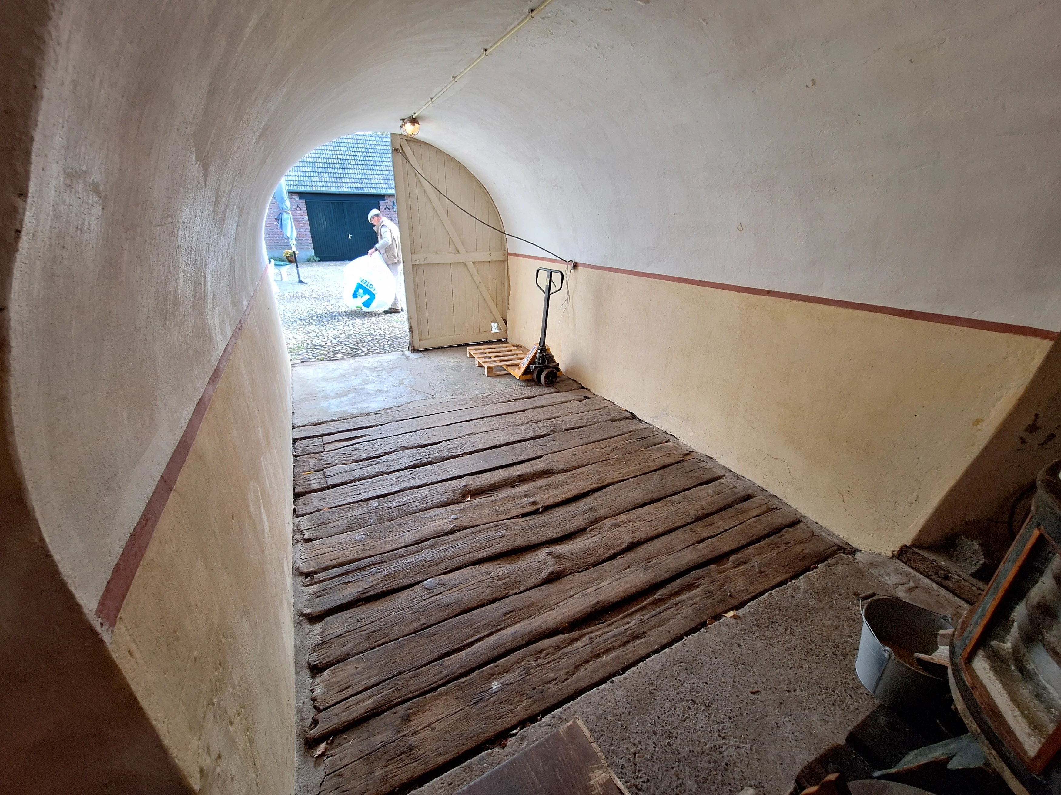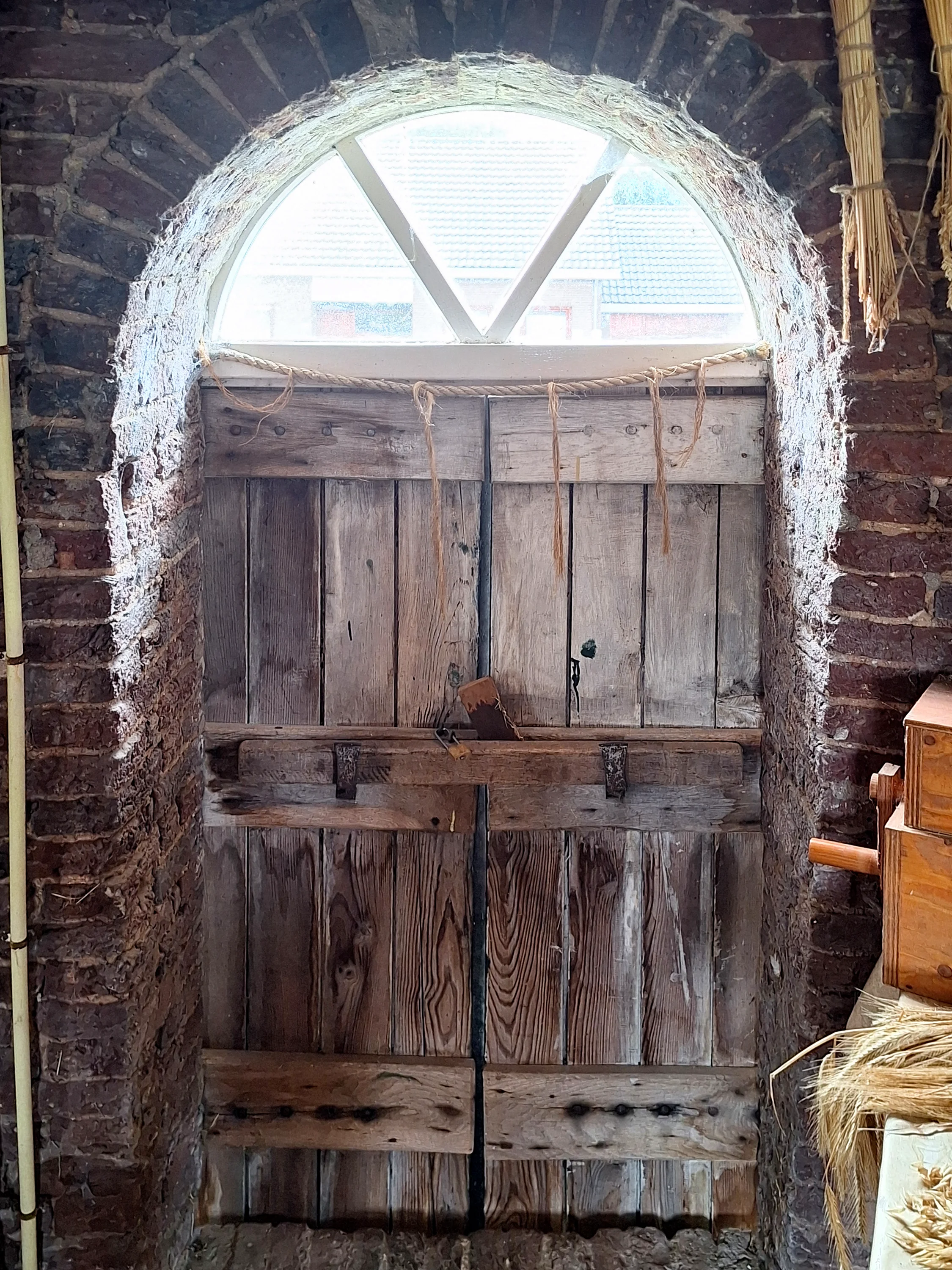 Vroeger met in- en uitladen van graan of meel stonden de paarden in de invaart, daarom zijn er houten planken in de invaart gelegd.