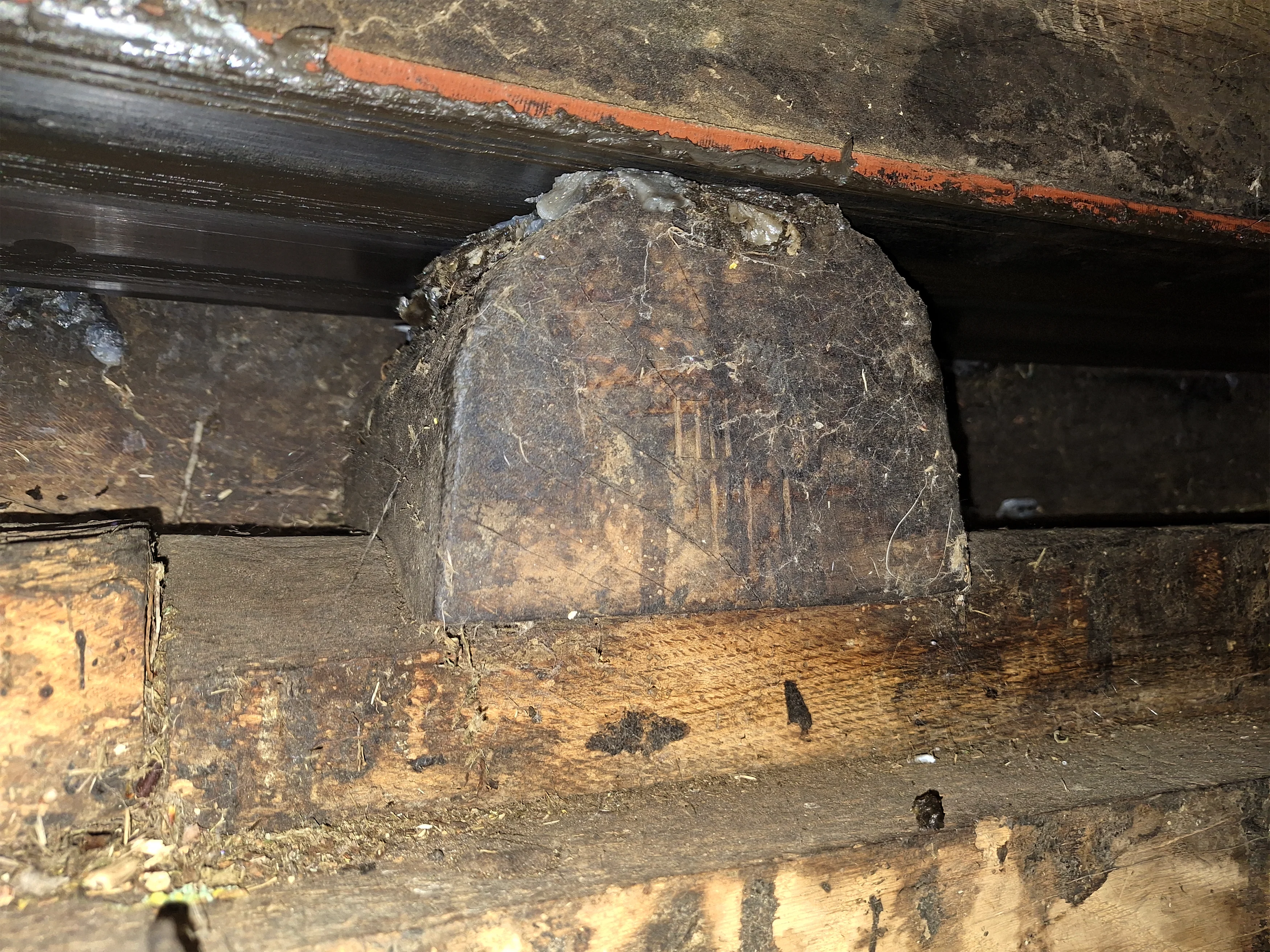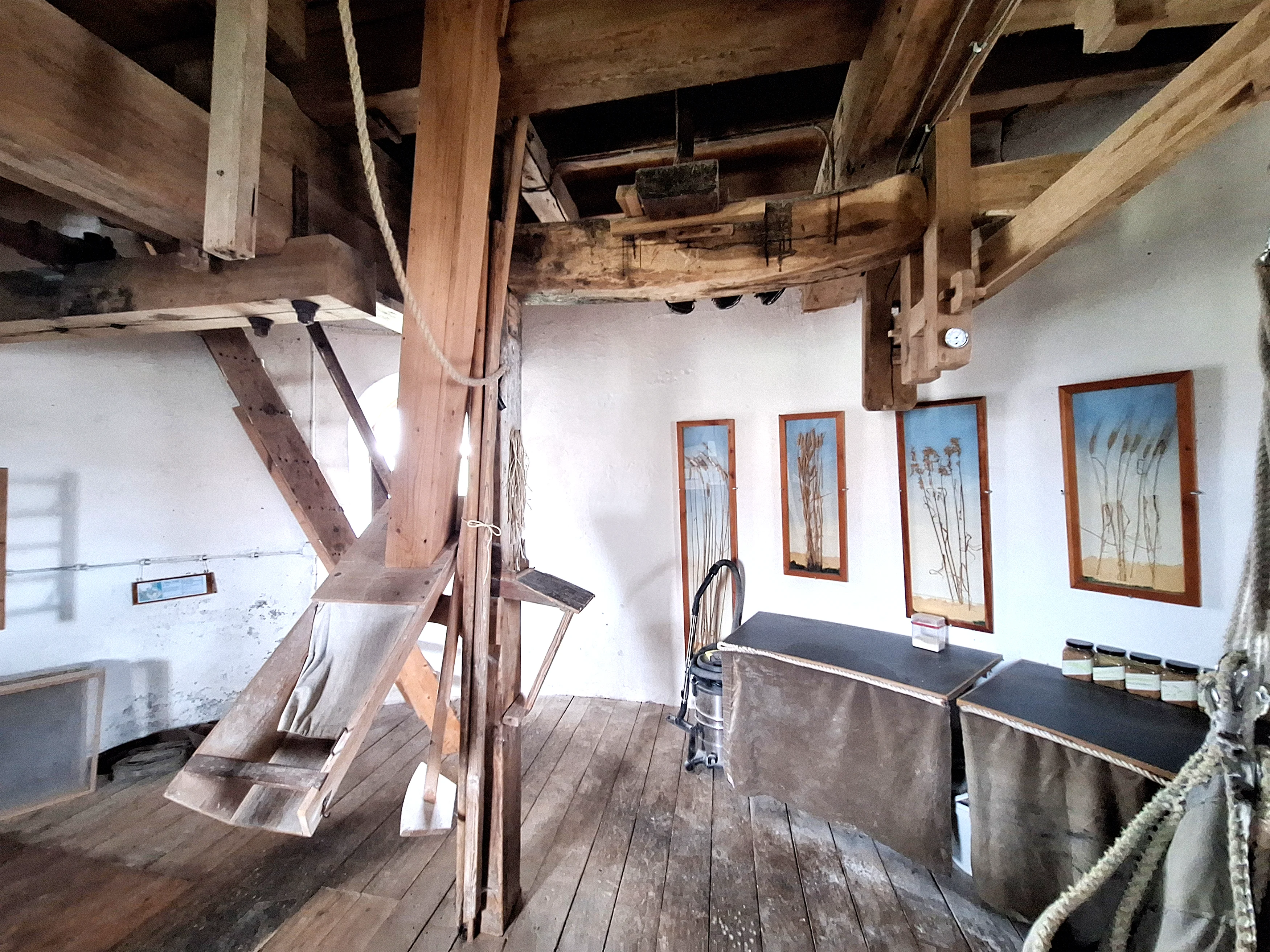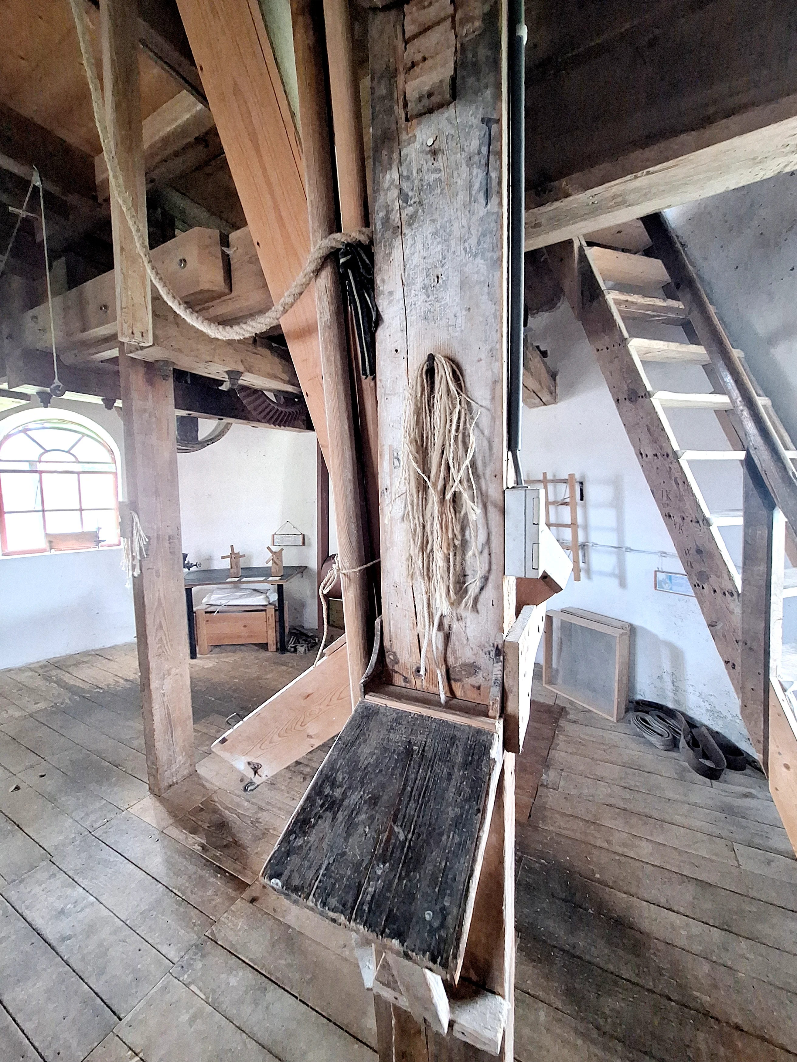 Molen 00909 Hackfortsche Molen / Op 't Hoge (Vorden)Jay Verkerk (14-06-2025) : "De ijzerbalk lijkt een oude middelbalk (ook met een dubbele functie als ijzerbalk), aangezien hij aan de rechterkant ondersteunt wordt (nog net zichtbaar achter het voeghout)."