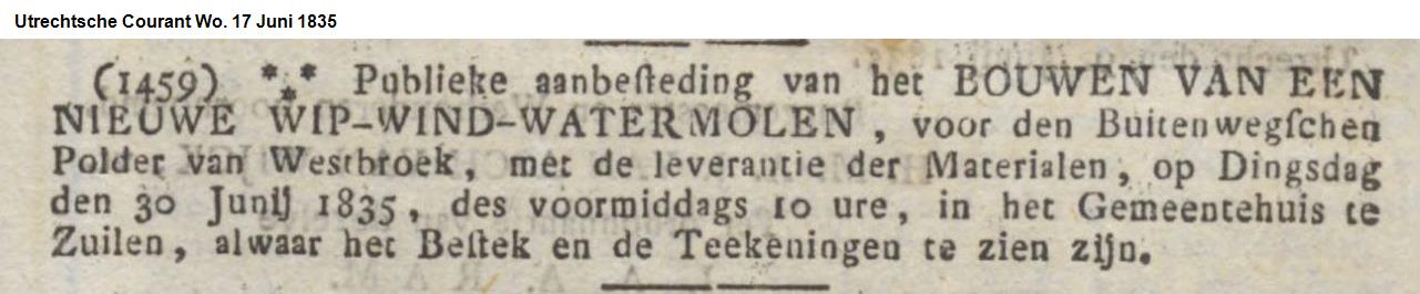 Van deze kleine wipmolen is het bouwjaar doorgaans gesteld op ‘1830’, of ‘ca. 1830’. Het blijkt in werkelijkheid toch iets anders te zijn: de Utrechtsche Courant van 17 juni 1835 vermeldt de “Publieke aanbesteding van het BOUWEN VAN EEN NIEUWE WIP-WIND-WATERMOLEN, voor den Buijtenwegschen Polder van Westbroek”. Uit een advertentie van bijna een jaar later in die courant valt af te leiden dat de molen er inmiddels staat. Met de bouw van deze molen zal in de tweede helft van 1835 zijn begonnen; het is aannemelijk dat deze molen in datzelfde jaar al maalvaardig was.