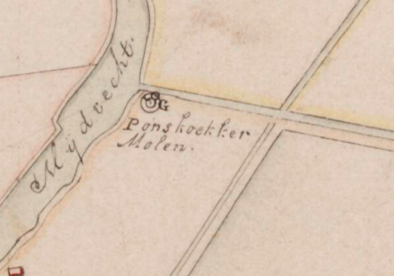 "Aangaande onweders op 19 en 20 dezer. In de gemeente Mijdrecht werd de Ponskoeker watermolen door den bliksem getroffen en brandde tot den grond toe af.