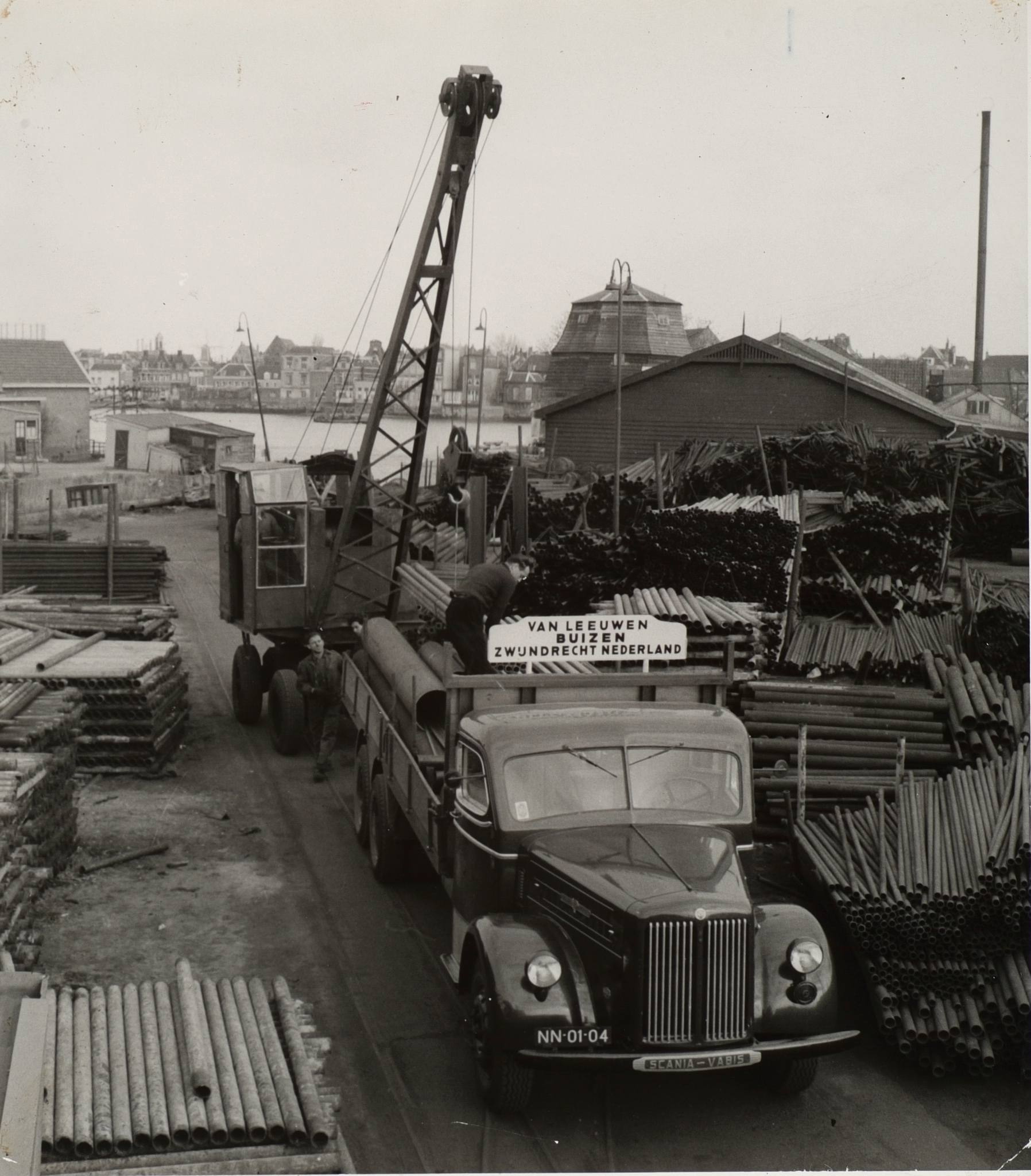 Molen 01270 Welgelegen / Dikke Molen (Zwijndrecht)Arbeiders aan het werk bij Van Leeuwen Buizen op het industrieterrein Oostkeetshaven langs de Oude Maas in Zwijndrecht, Ringdijk 188 indertijd. De afgeknotte molenromp is de molen Welgelegen. collectie RAD