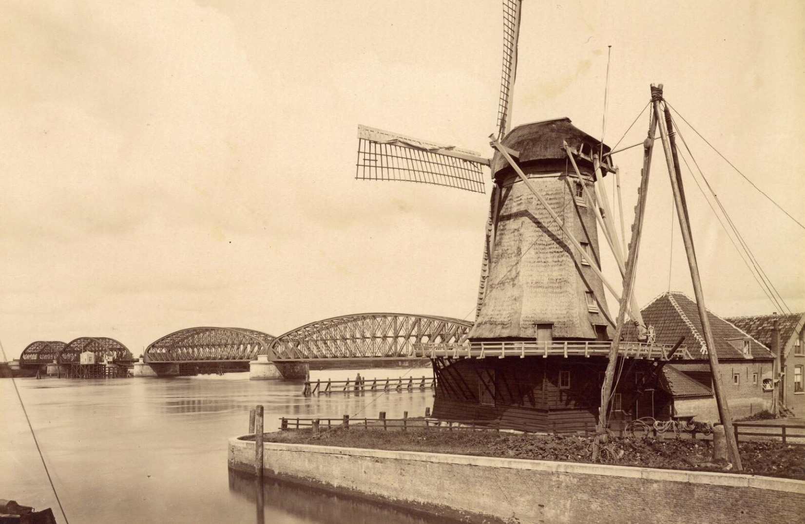 Molen 01518 De Zeelt (Dordrecht)Gezicht op de spoorbrug over de Oude Maas te Dordrecht met rechts op de voorgrond een molen.Foto collectie Utrechts Srchief