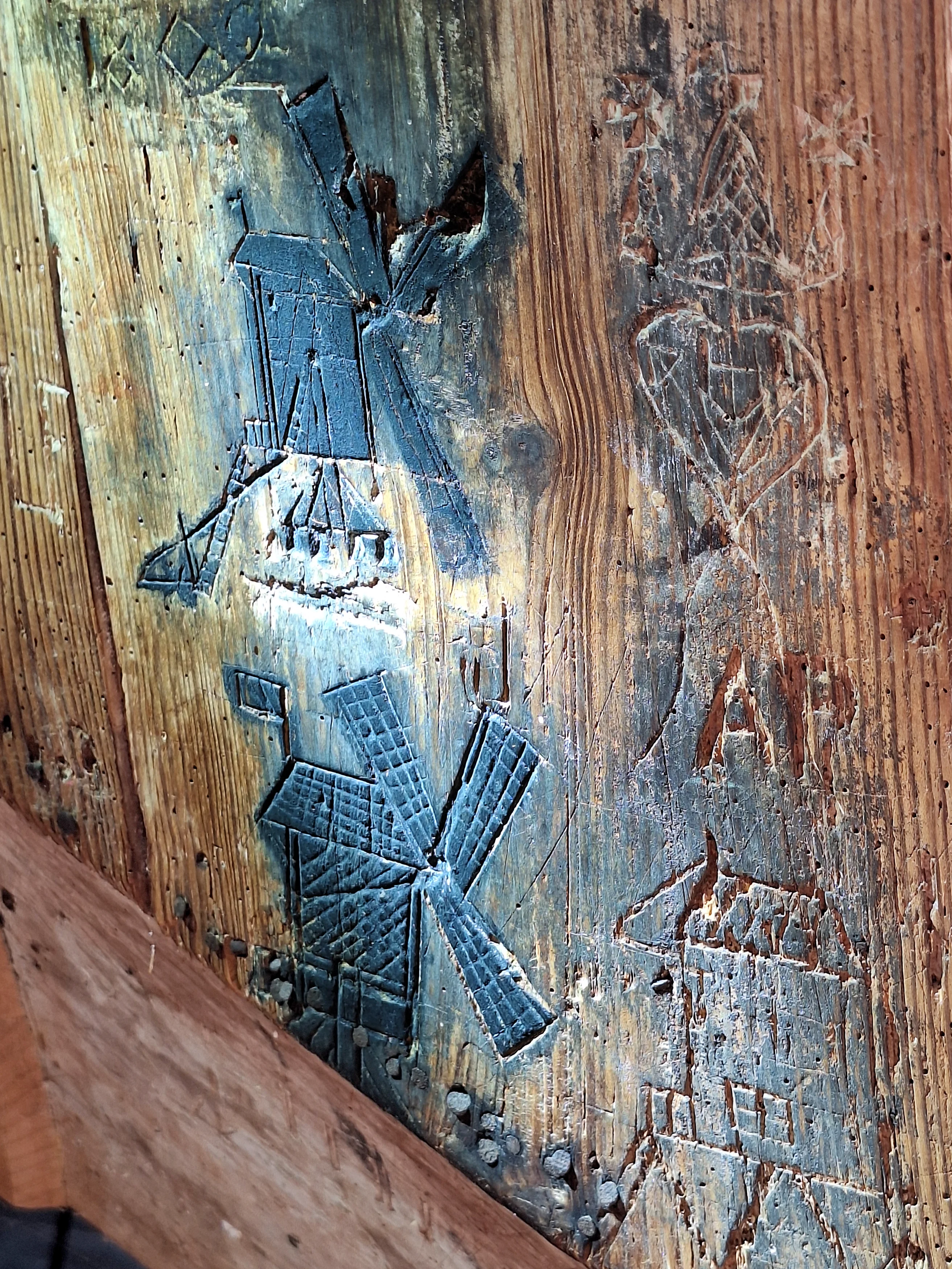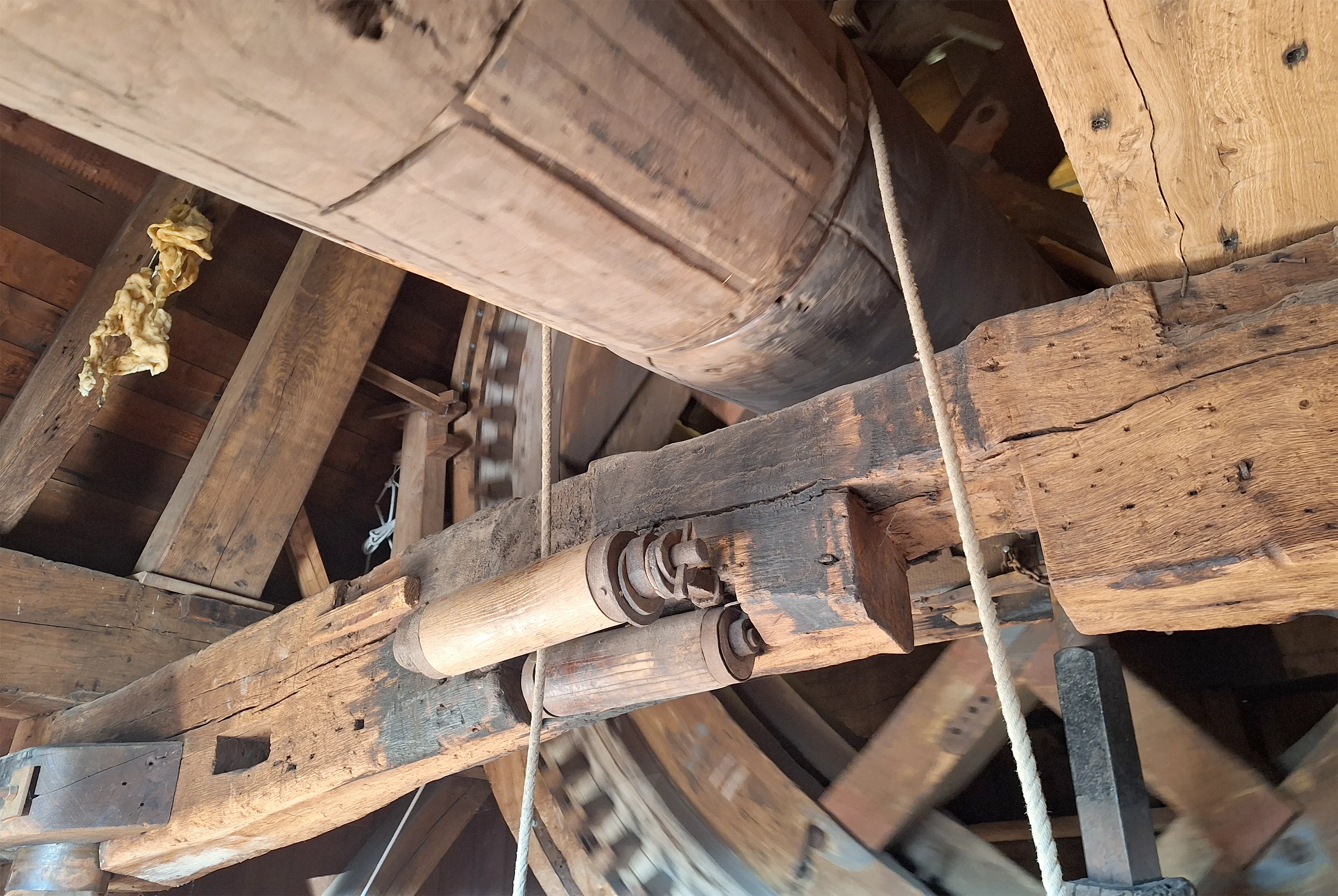 Te zien zijn het bovenwiel, de vang, maalkoppel en de houten as.