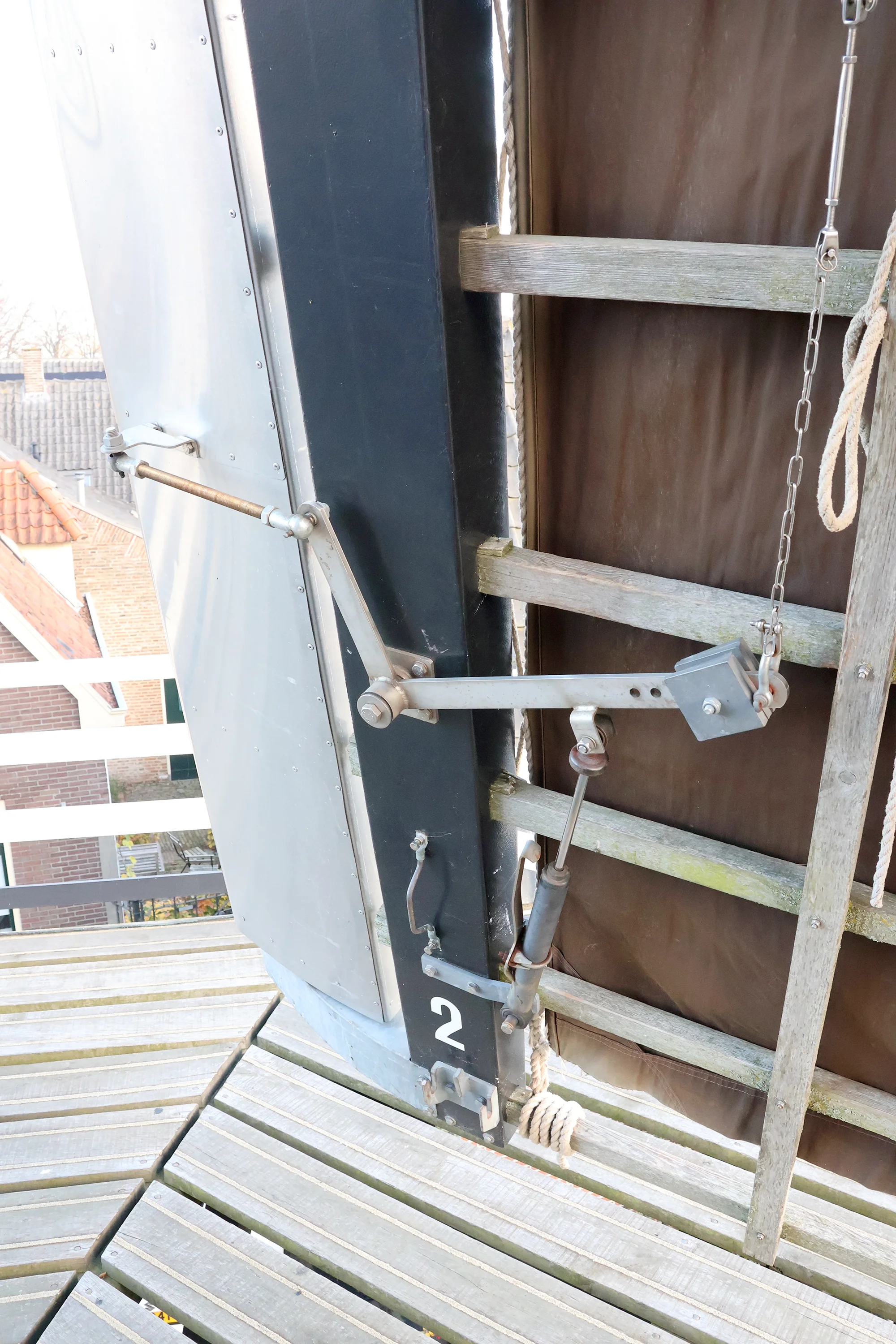 Deze foto laat een detail zien van de Bussel neuzen en de remkleppen. Bij deze molen is gekozen om de restauratie uit te voeren inclusief de restauratie van de Bussel neuzen.