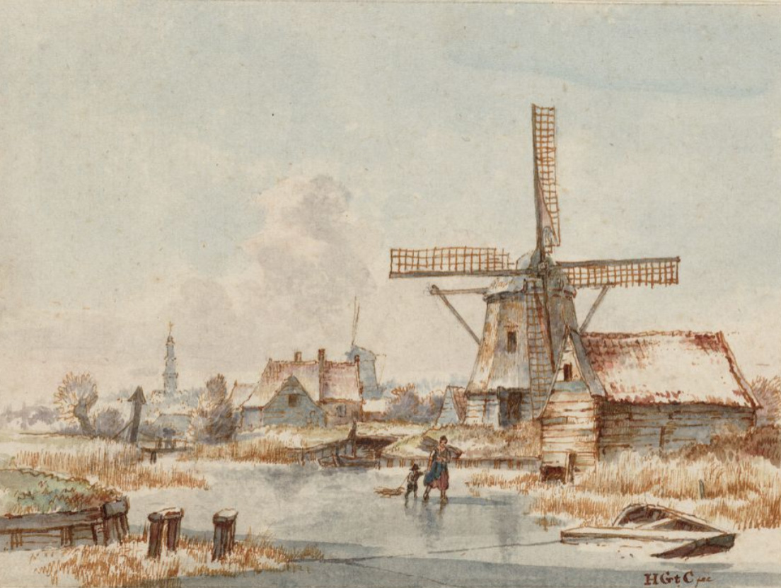 Molen 02484 d Sloterbinnen- en Middelveldse Gecombineerde Polders, Noordermolen / Baarsjesmolen (Amsterdam)Tekening van H.G. ten Cate, ca 1800/1850, De Noordermolen van de Sloterbinnen- en Middenveldsche Gecombineerde Polders aan de Kostverlorenvaart bij de huidige Wiegbrug, in het verlengde van de De Clercqstraat. Op de achtergrond de molen De Victor op het bolwerk Rijk en de Westertoren.