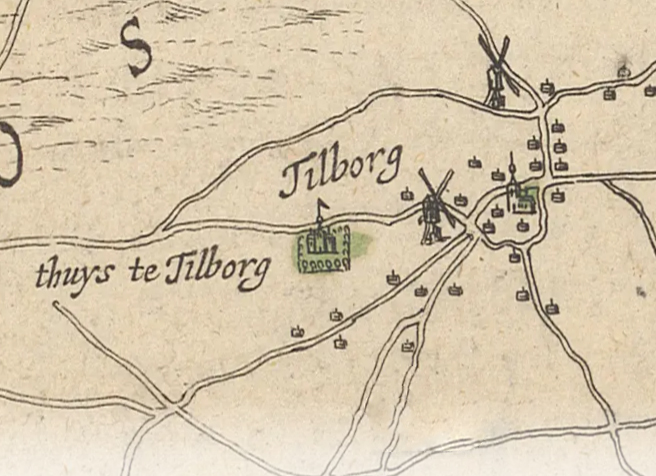 Tilburg, 1,3 km ZW station, Korvelsche Schijf, in knie Meelstraat-Capucijnenstraat