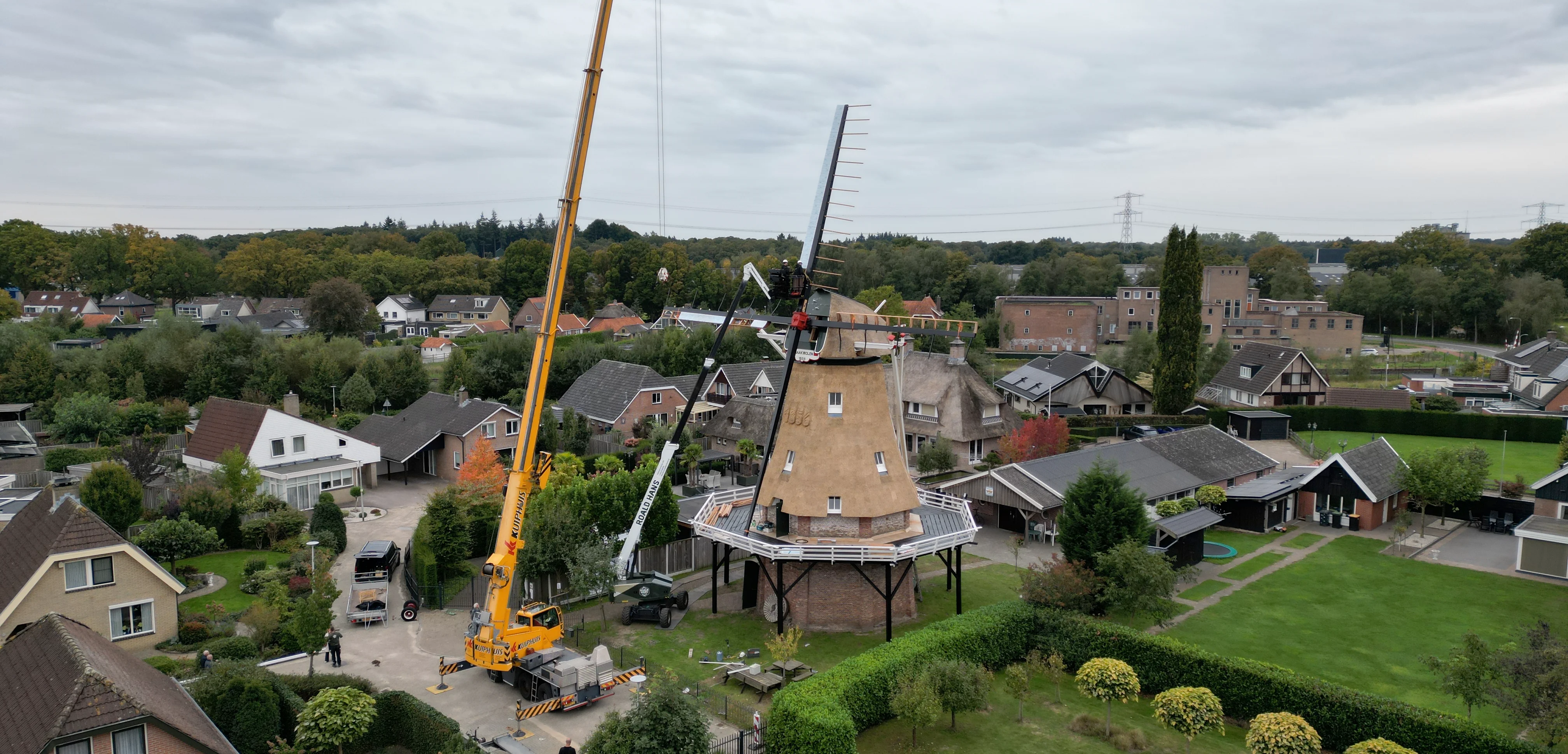 De molen komt weer tevoorschijn, nadat er nieuw riet is aangebracht op kap en deels op het achtkant. Nog even en de roeden kunnen weer gestoken worden.Molen 02667 De Braakmolen (Goor)Matthijs Ero (24-03-2025)
