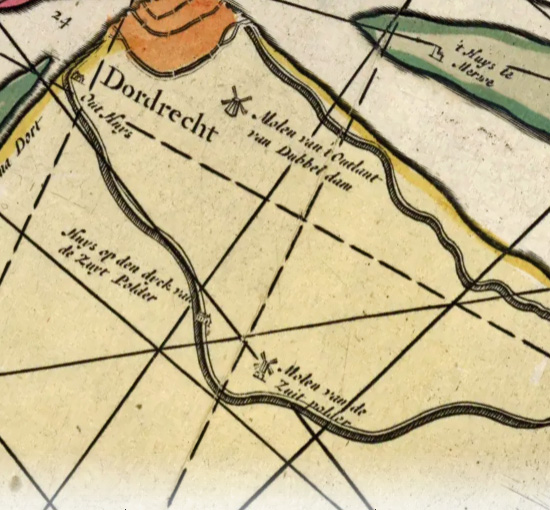 Molen 02877 d Zuidpolder (Dordrecht)detail van de kaart van Paskaerte van het inkoomen van de Maes Tot aen 't Eylandt Roosenburgh als mede 't Inkoomen van't Goereesche gat, tot aen Oude Hoornfluys, met hunne Drooghte en Diepte Seer Naeukeurich opgestelt1716|Keulen, Johannes van, bron: oldmapsonline