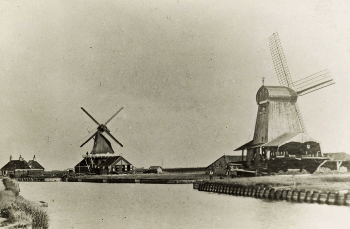 Molen 03011 a De Gideon (Franeker/ Frjentsjer)Foto coll. DHM; links Molen de Valck, rechts Molen de Gideon