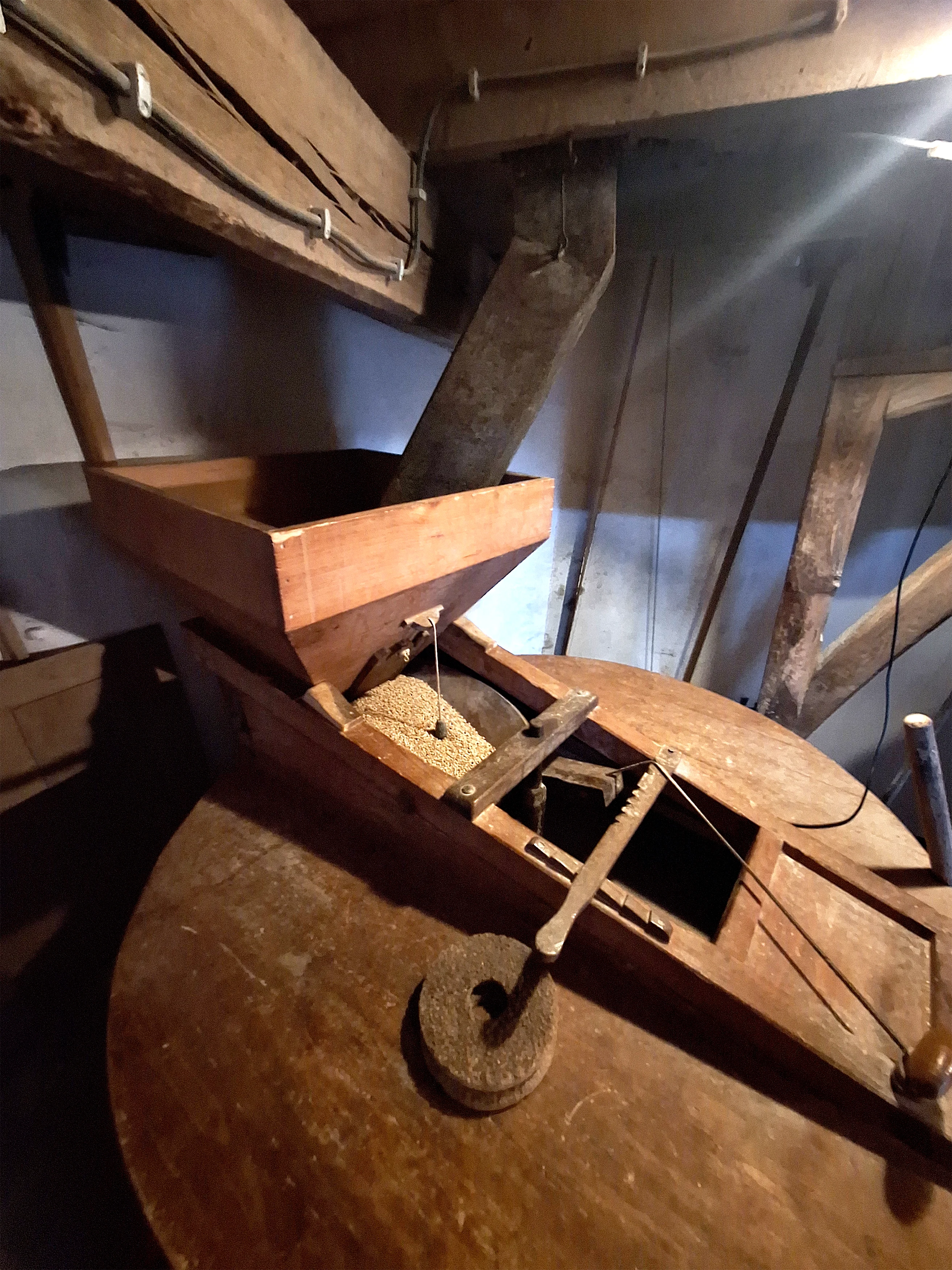 Het maalkoppel met toevoer, vanuit de silo een op de eerste zolder (belt).