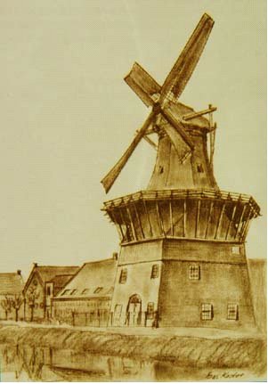 Het vierkante, witte markante gebouw aan de Hoornseweg en naastliggende bebouwing zijn zo ongeveer het enig overgebleven restant van de oliemolens die in Zuid-Holland vaak nabij grote steden stonden. De heer Bas Koster tekende de molen zoals hij eruit gezien zou hebben destijds. - nog waarneembaar