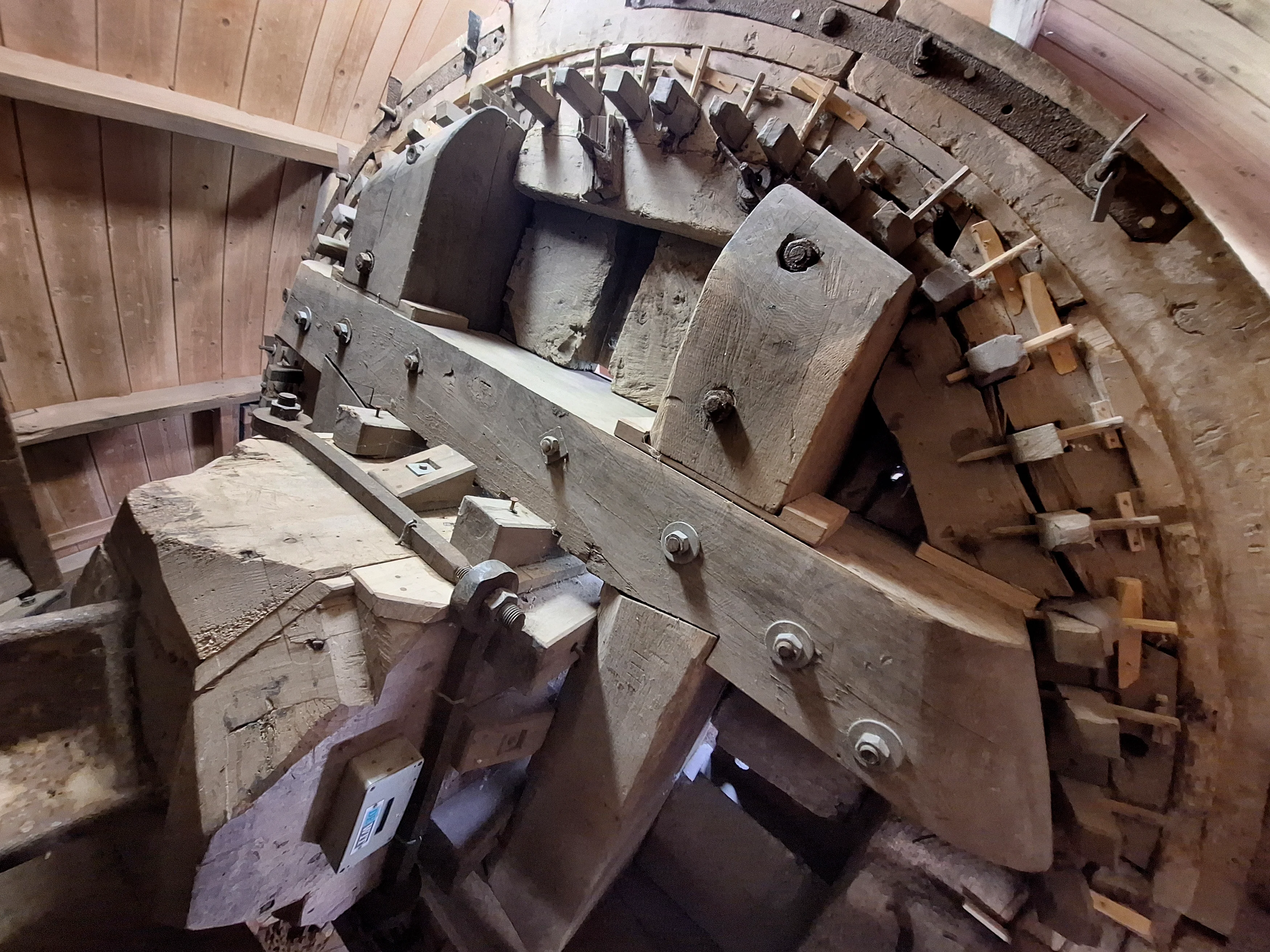 Het zeer zwaar en vrijwel dicht uitgevoerde bovenwiel. Aan de kepen in de plooistukken is nog te zien dat dit ooit een spaakwiel was.