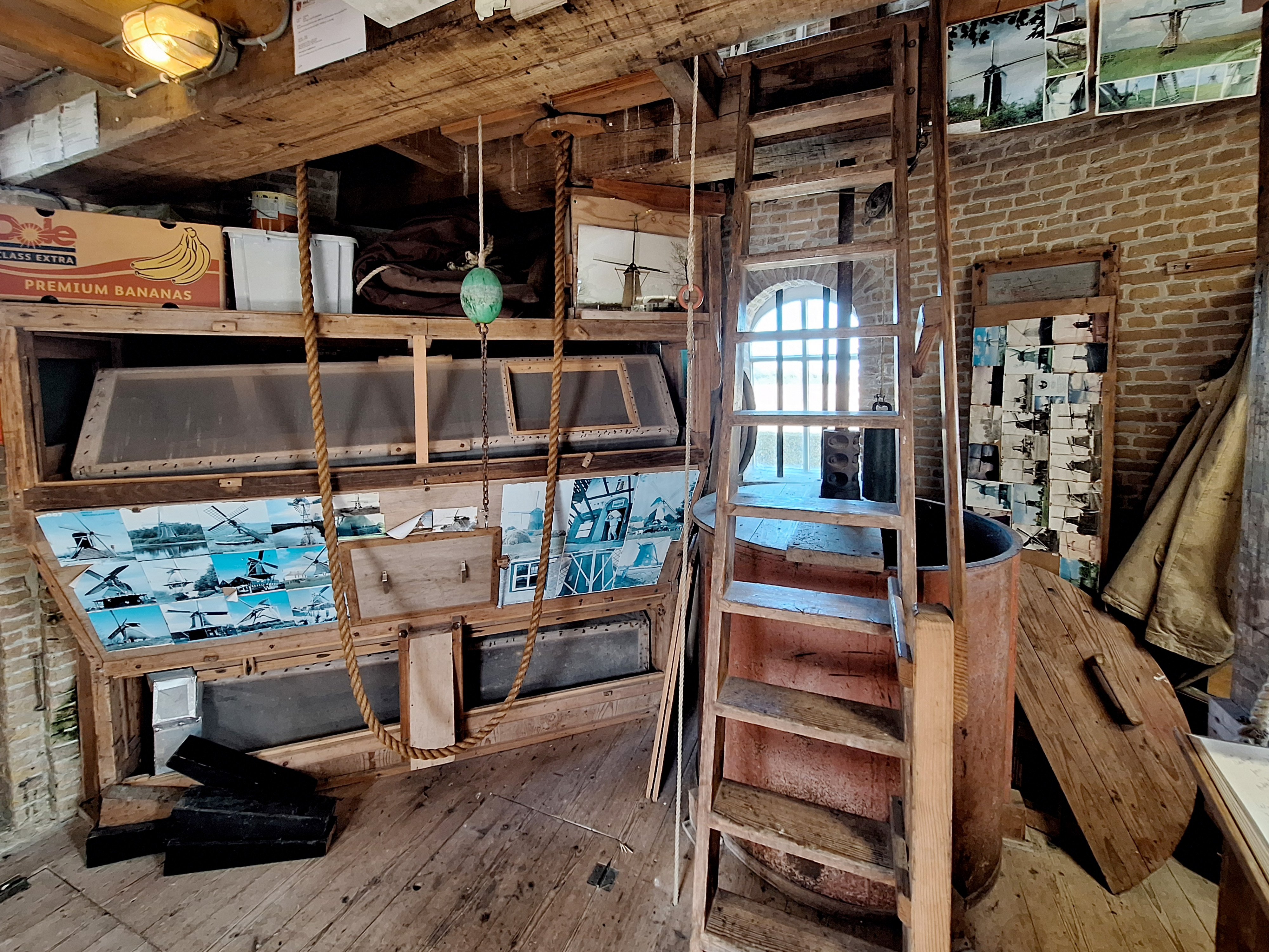 Links de buil en achter de zeer smalle trap is de mengketel te zien, deze kan worden afgetapt in de kelder.