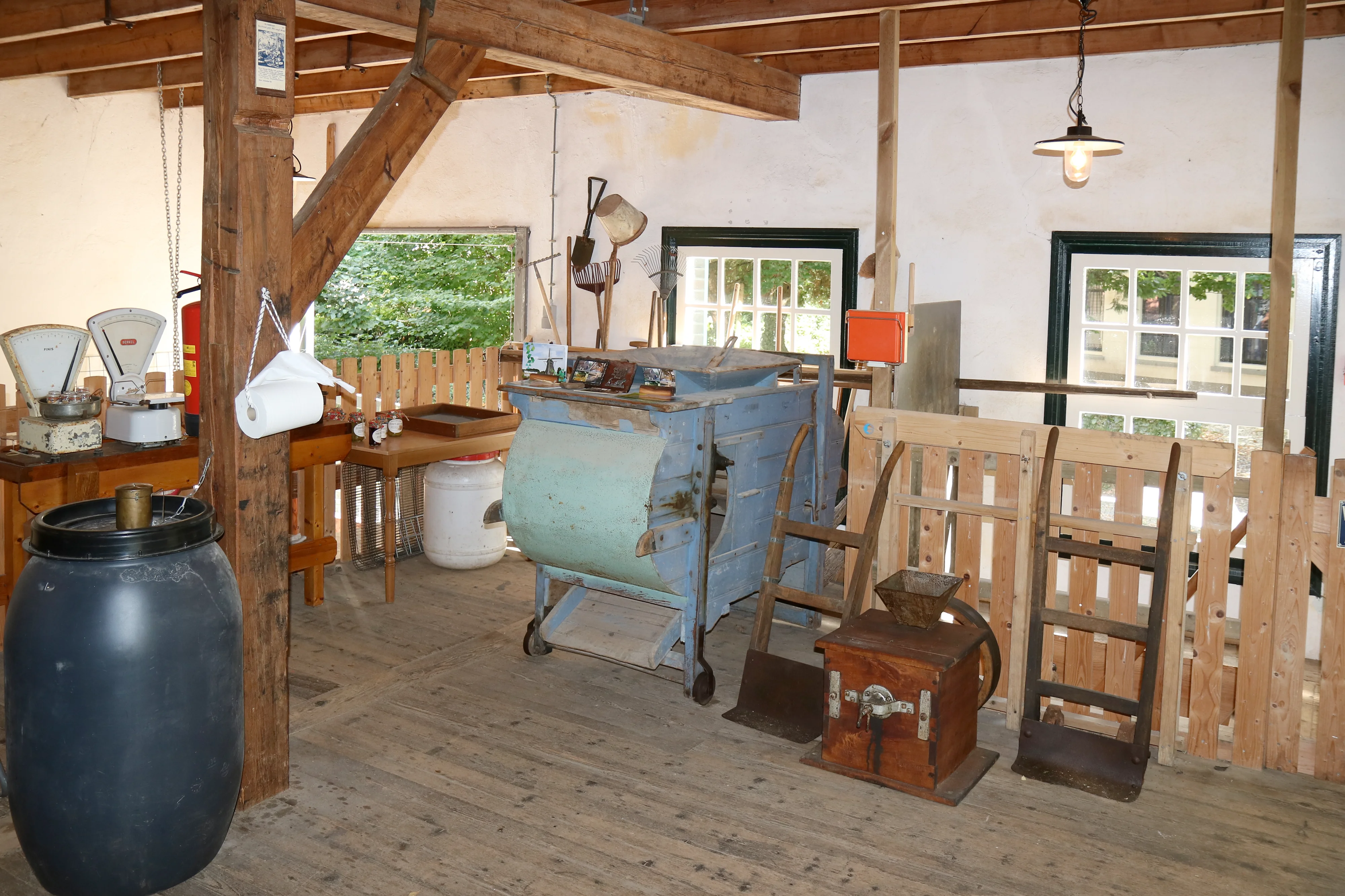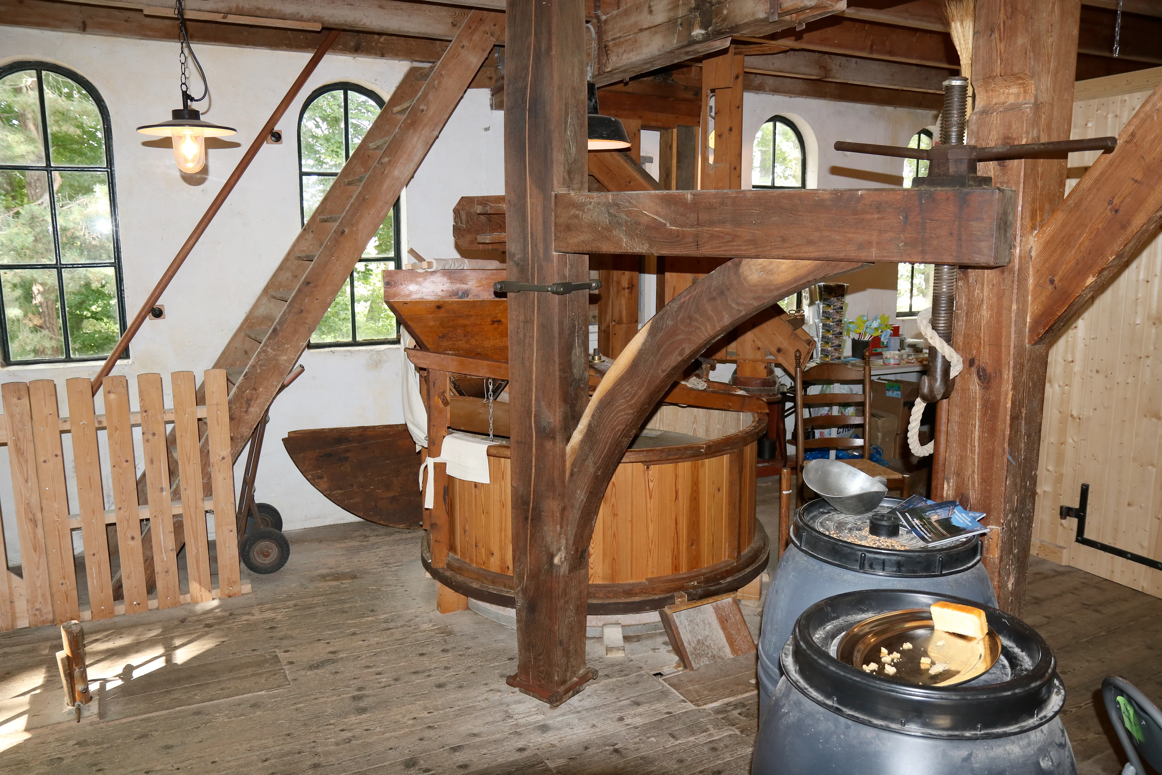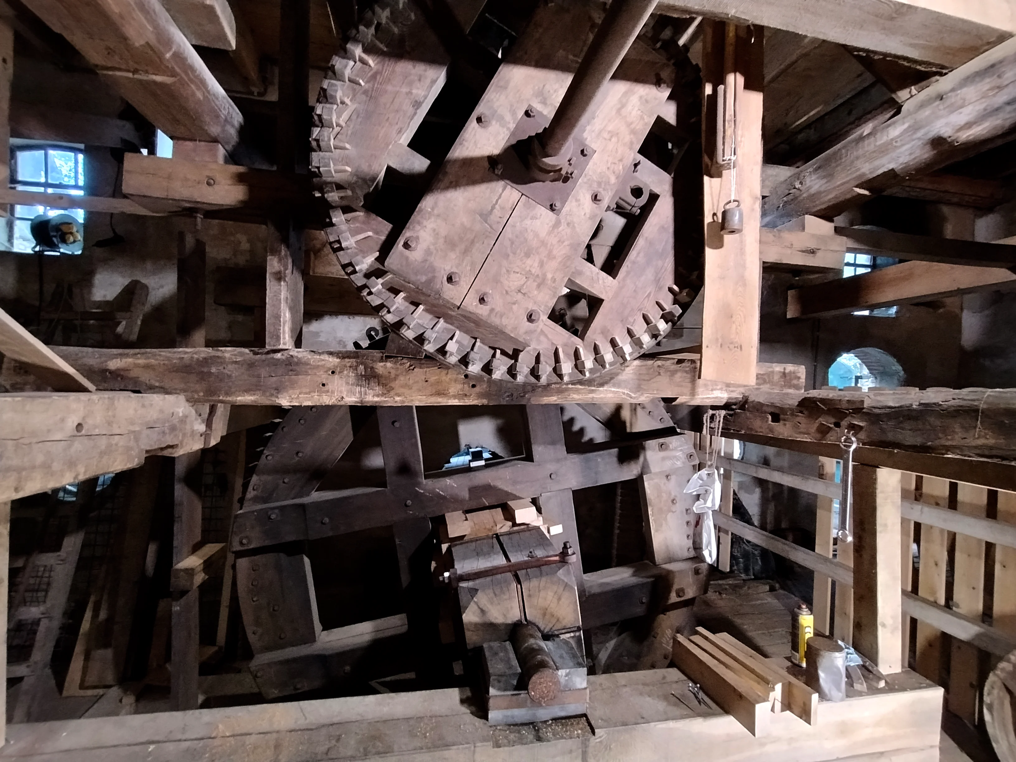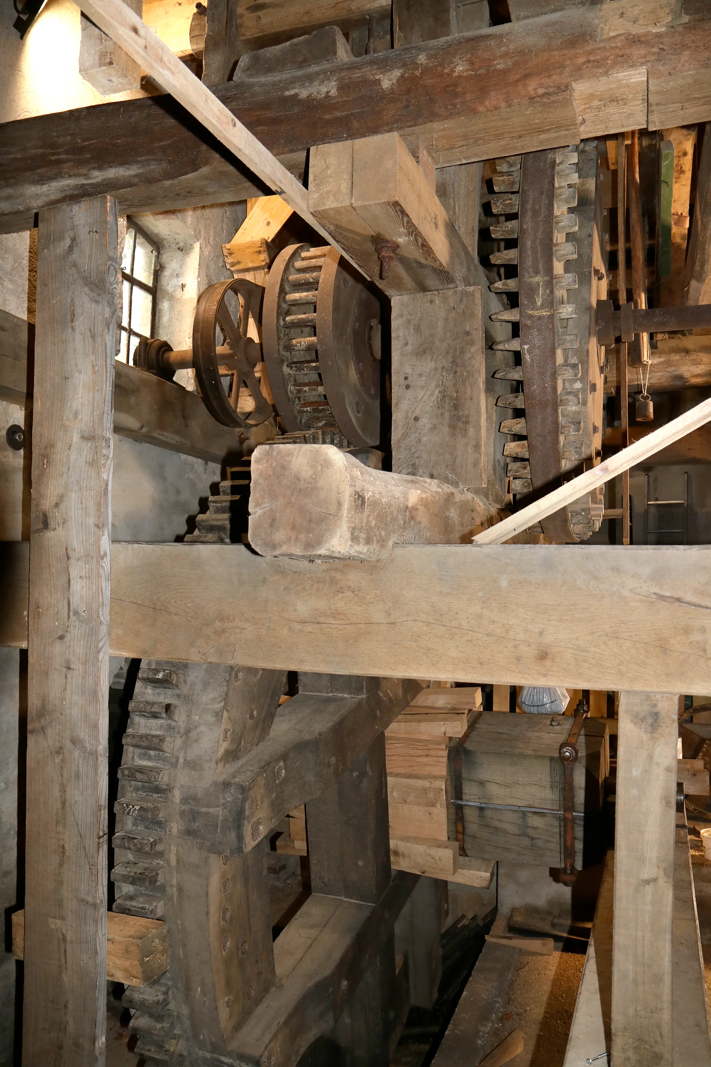 Via het waterwiel (onder) worden de korenmolen en de zaagmolen aangedreven.
