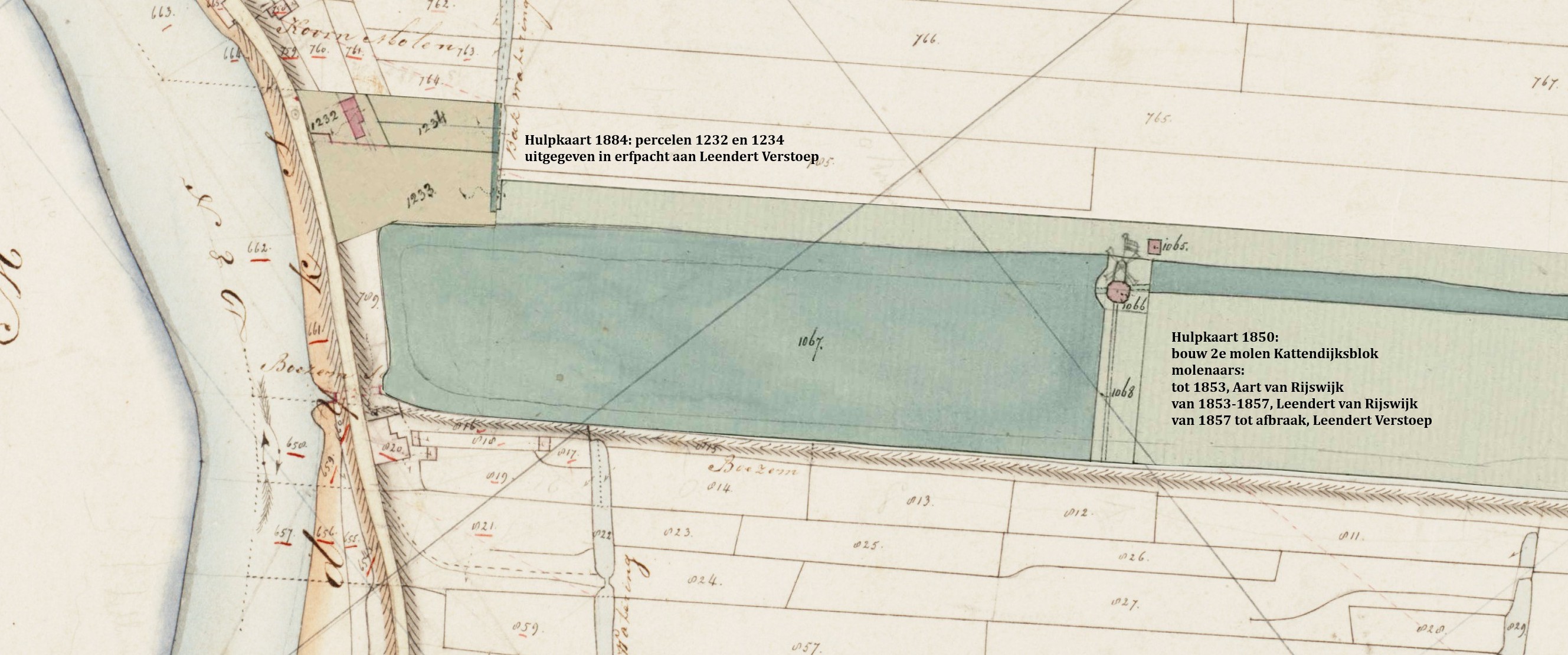 Molen 03937 f Waterschap Stolwijk, deel Kattendijksblok (2e) (Gouderak)"Kadastraal minuutplan 1832 met als inzet de hulpkaarten van de bouw van de molen in 1848 (Gouderak A6) en de bouw van het huis bij de dijk tbv Leendert Verstoep in 1882 (Gouderak A47). De ingetekende molen heeft zelfs de vlag in top!"