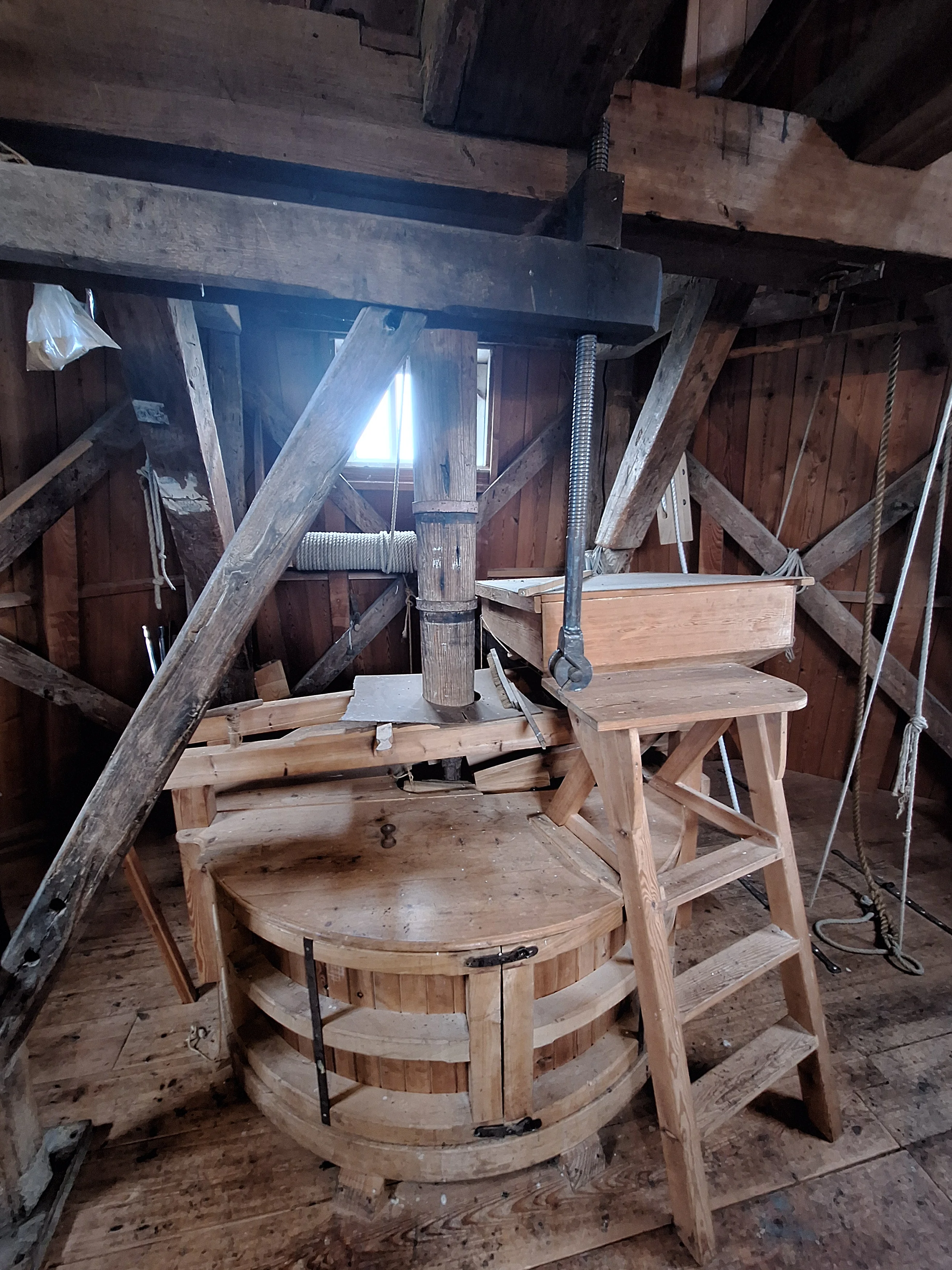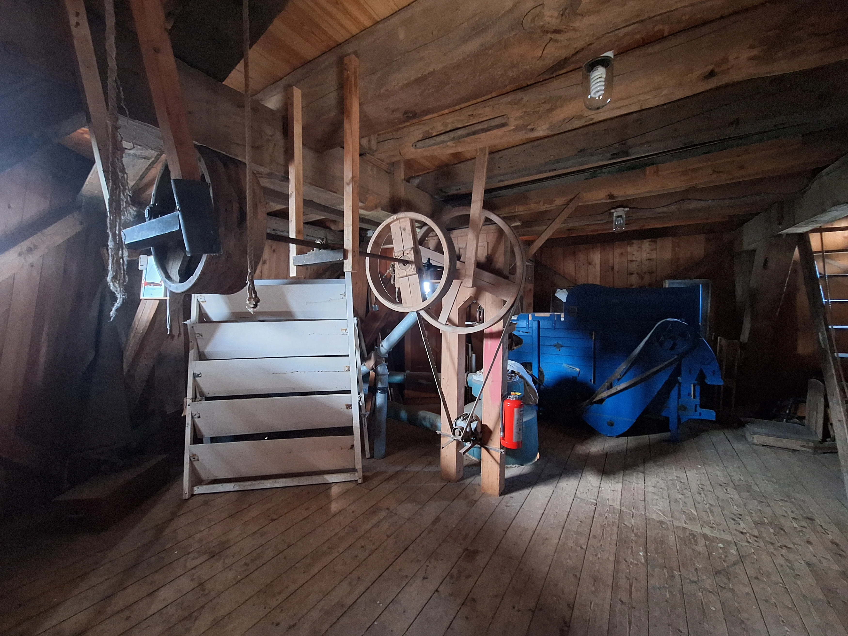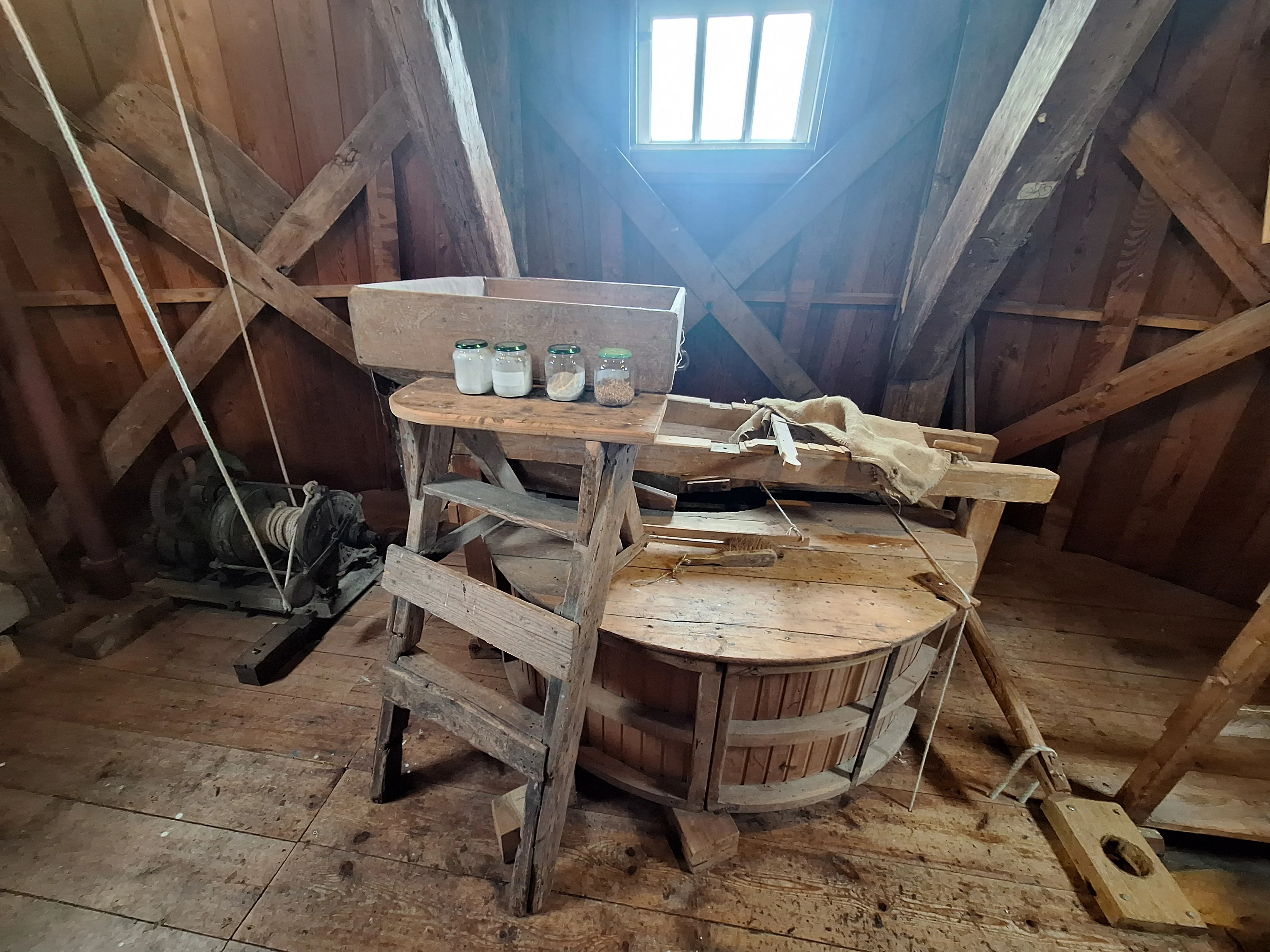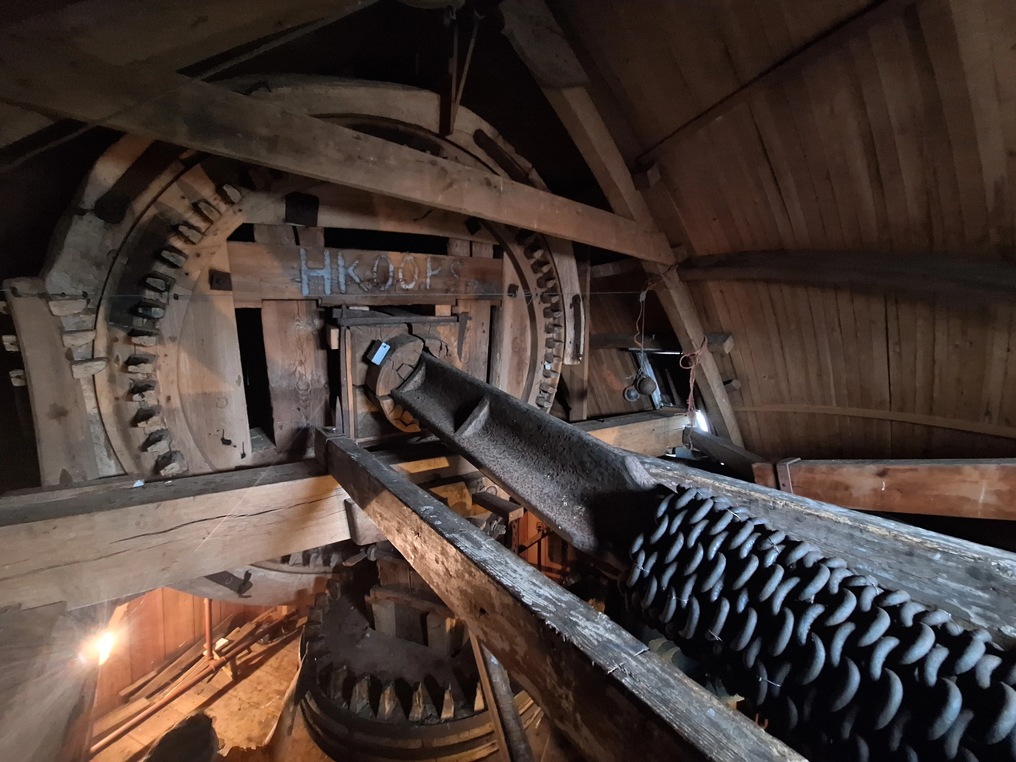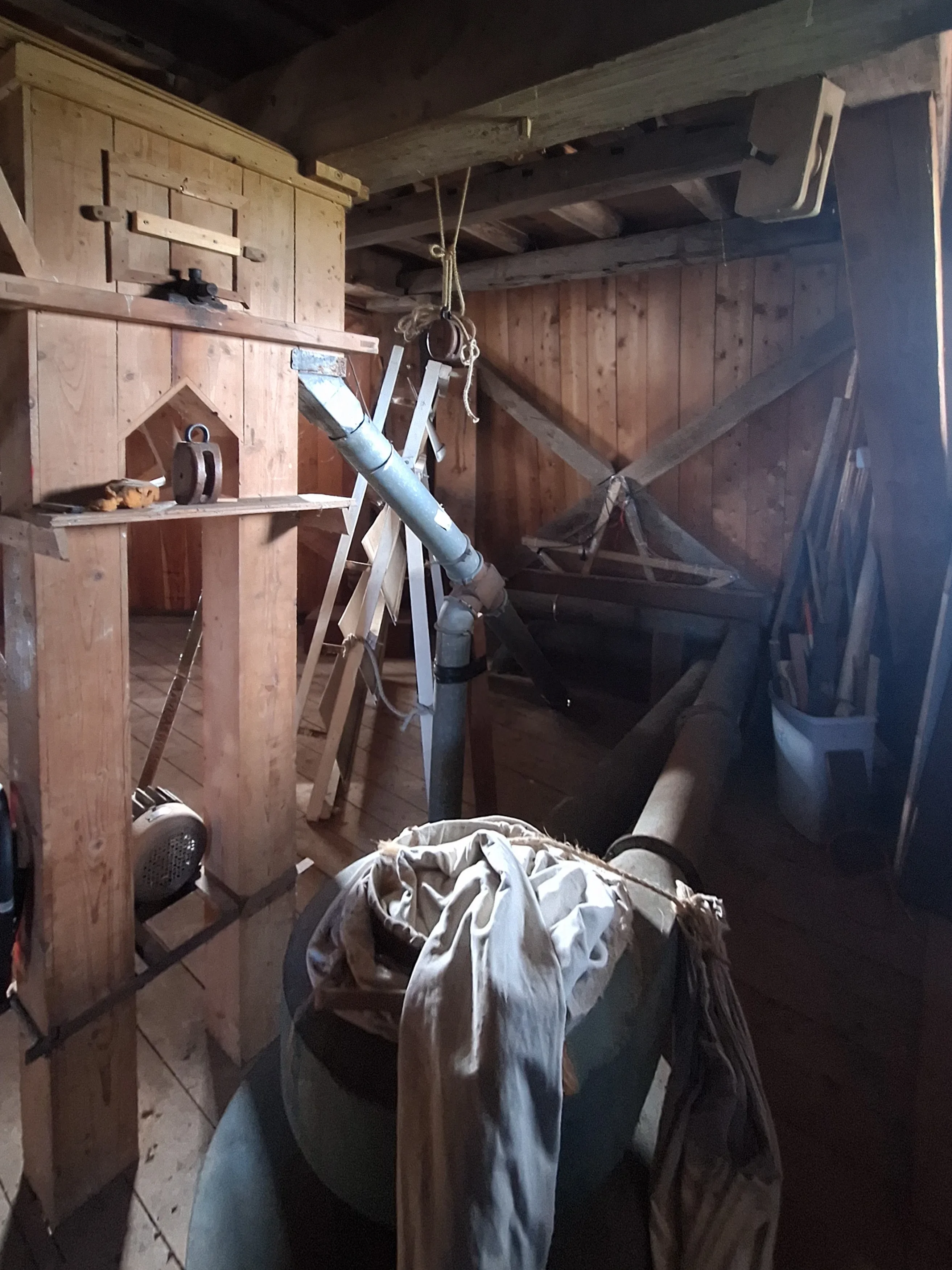 De kuip van het maalkoppel is gedemonteerd. Bij het raam is de kaapstander te zien, gemaakt van een spruit van de Noordenveld.