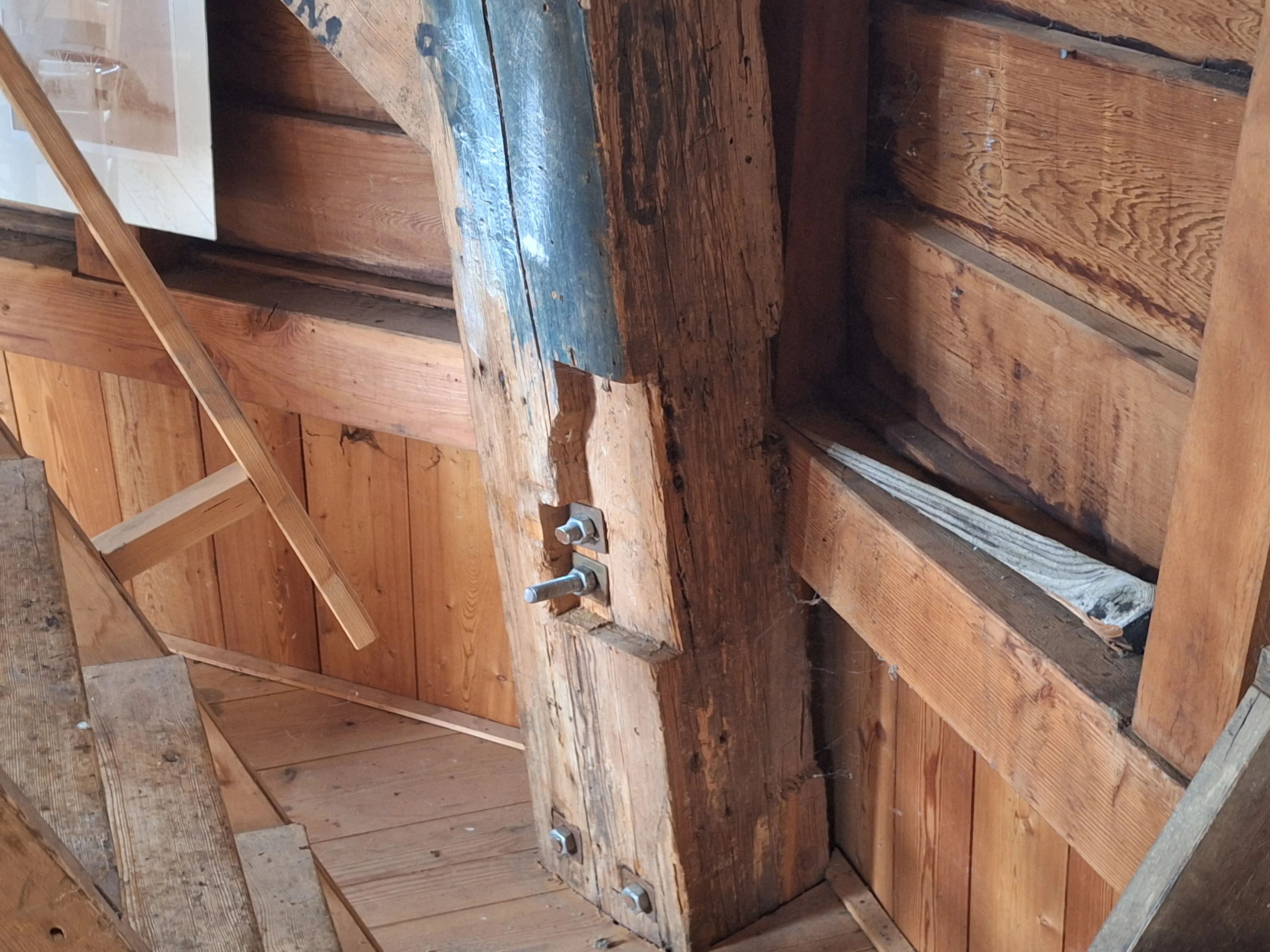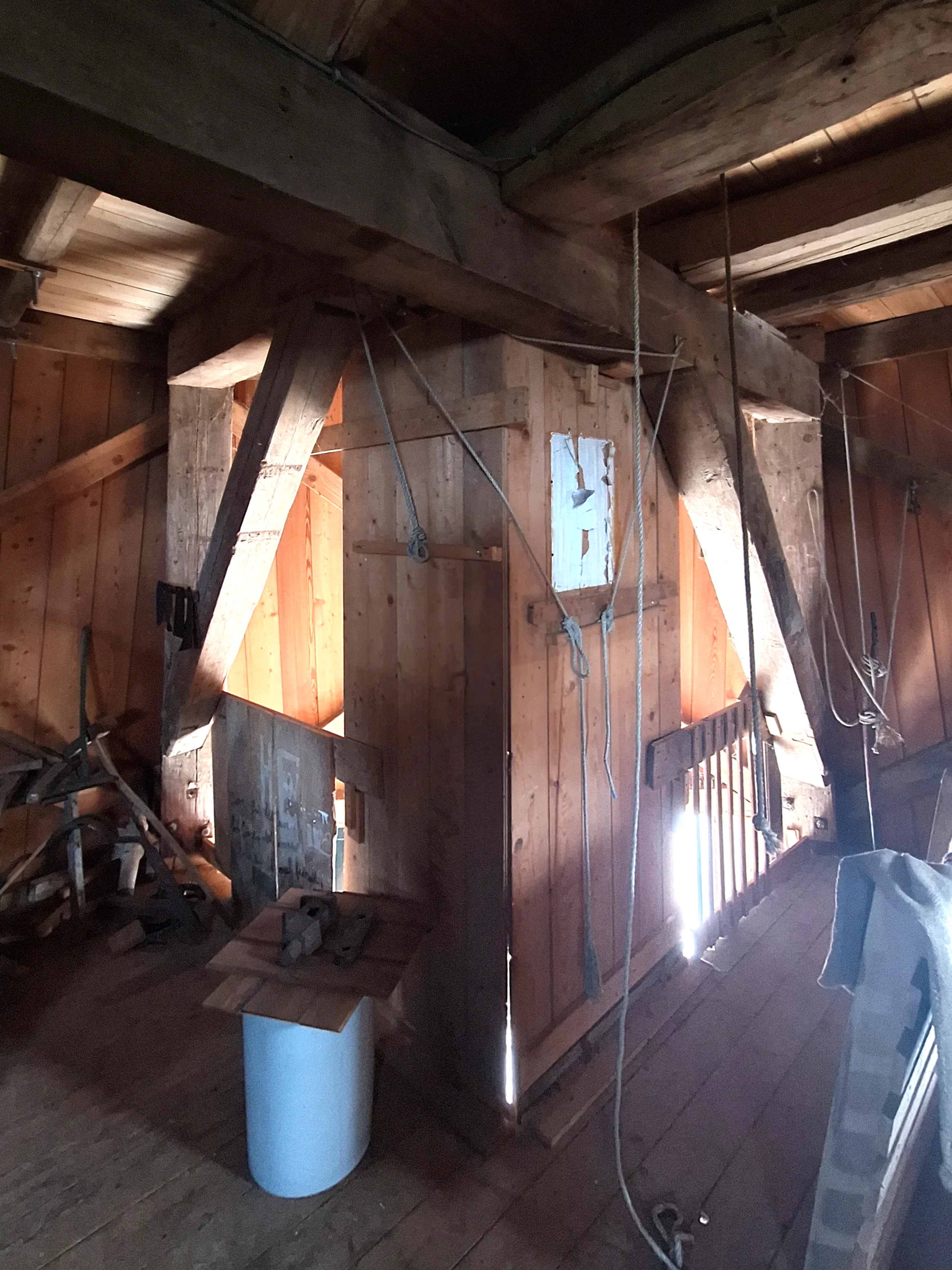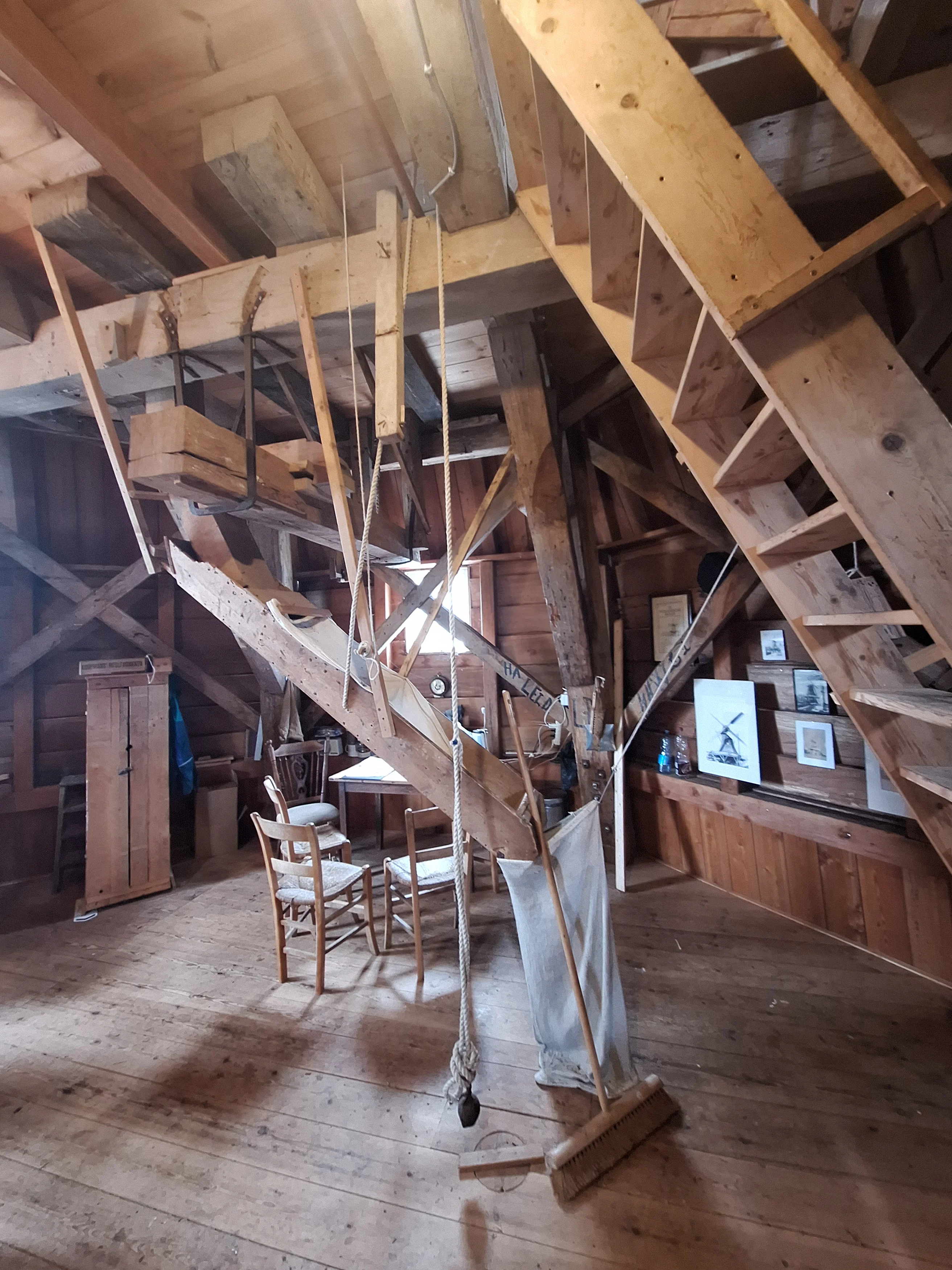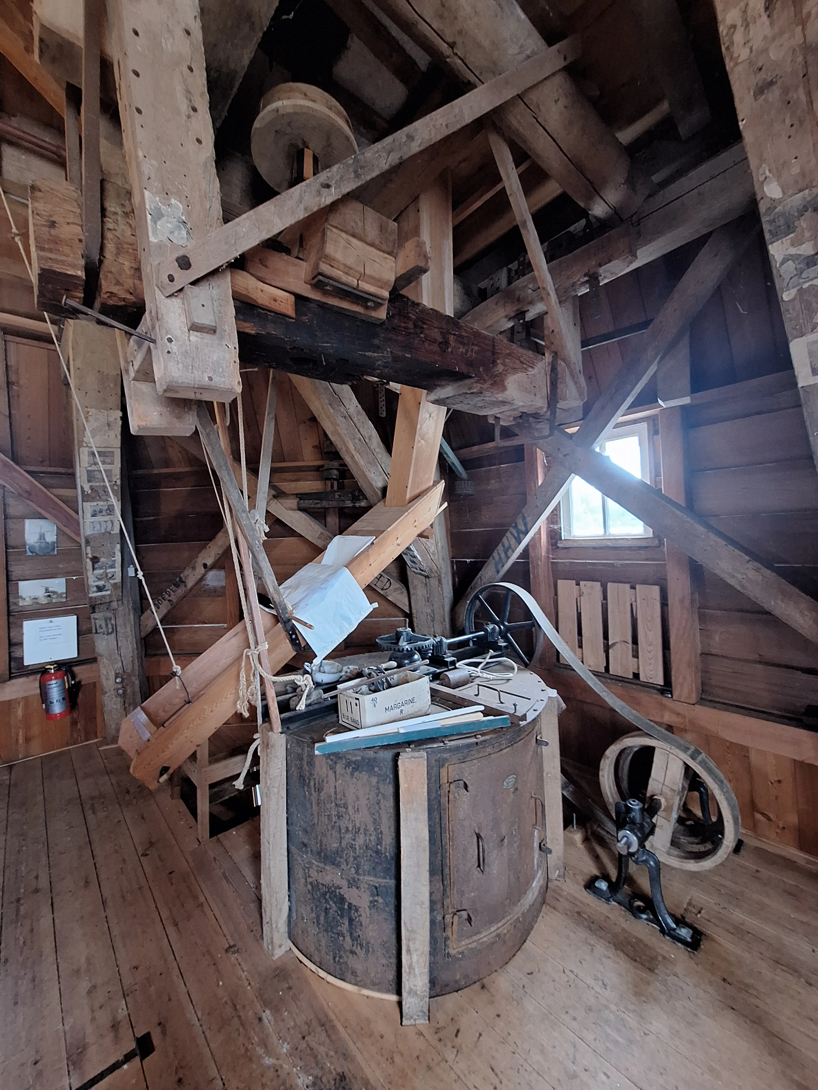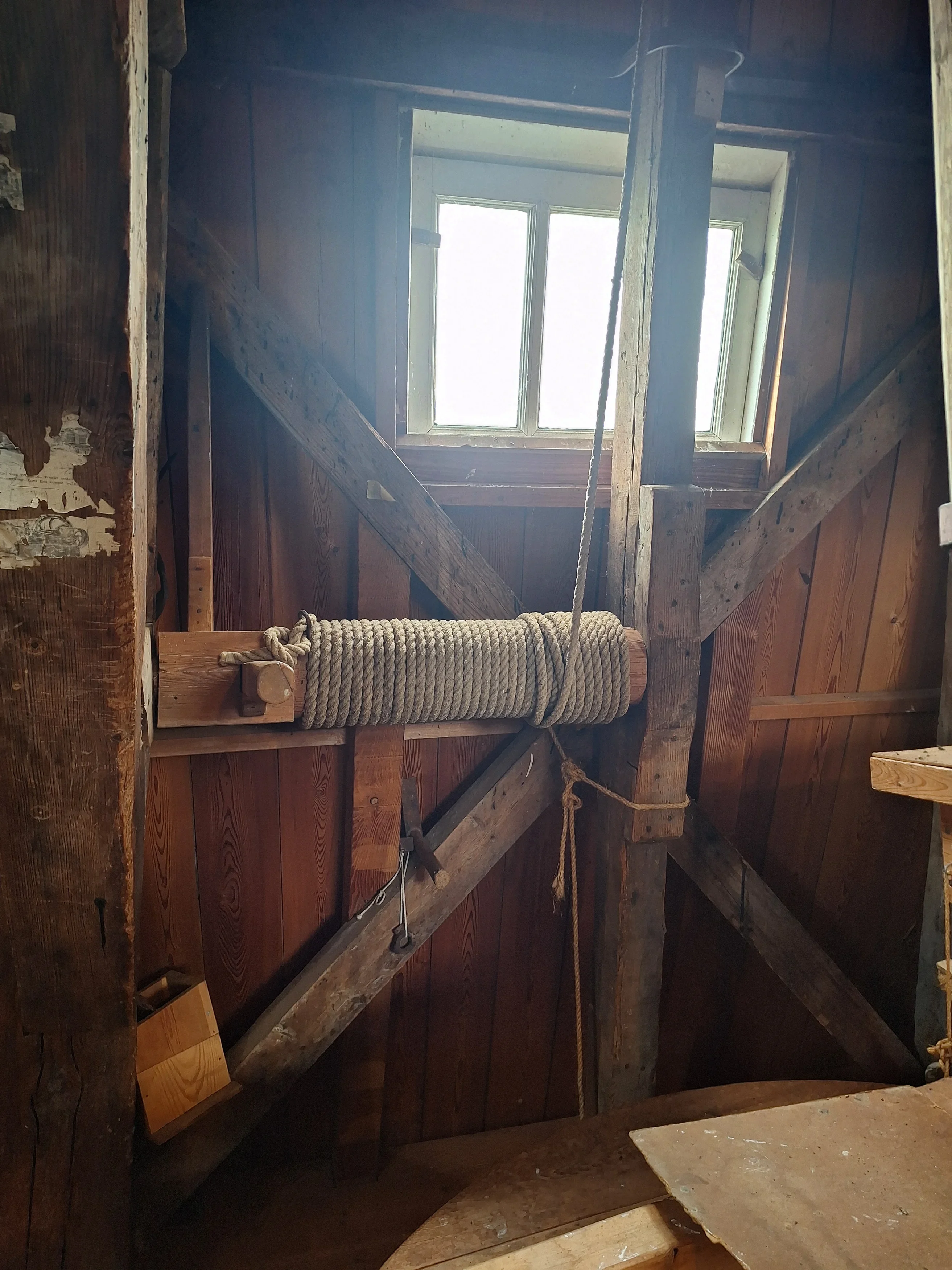 De kuip van het maalkoppel is gedemonteerd. Bij het raam is de kaapstander te zien, gemaakt van een spruit van de Noordenveld.