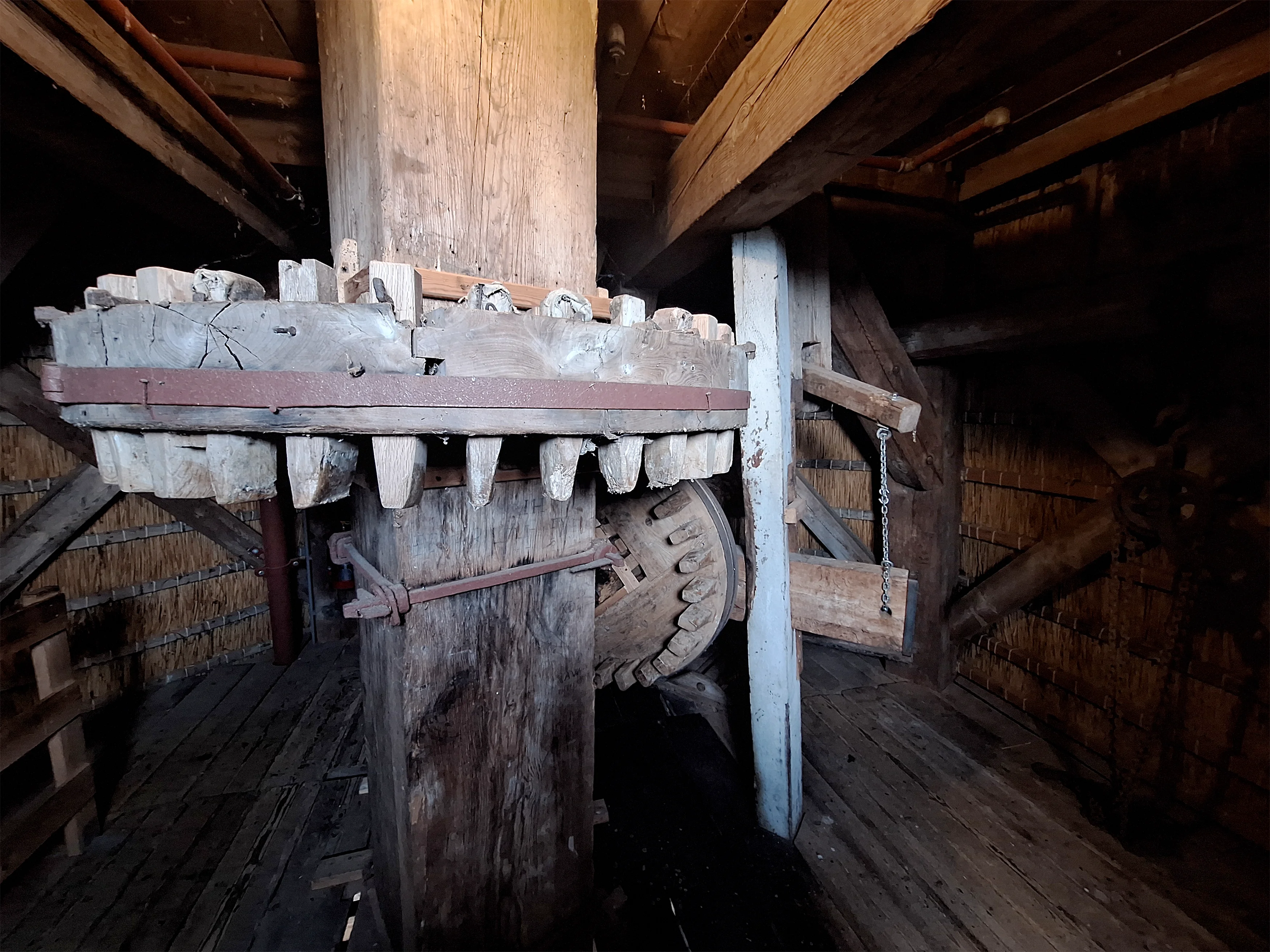 Het wind aangedreven koppel met een steenspil van drie zolders lang (zolder onder de stelling tot zolder boven de stelling).