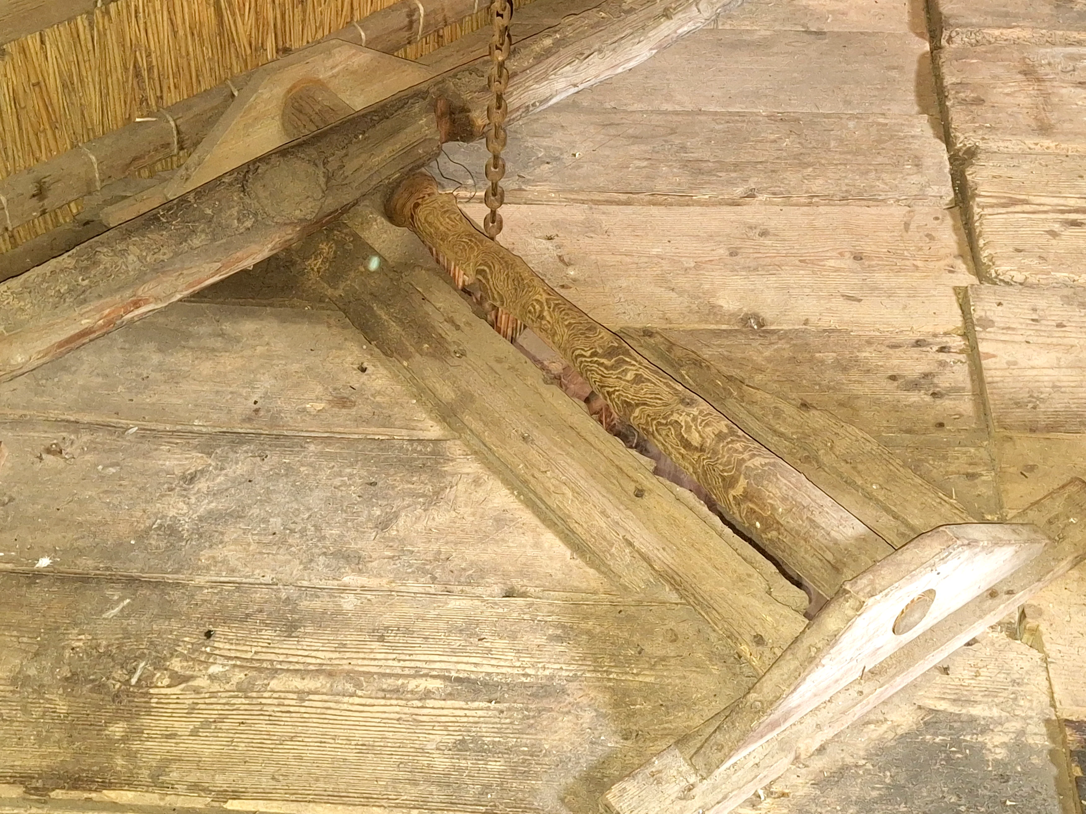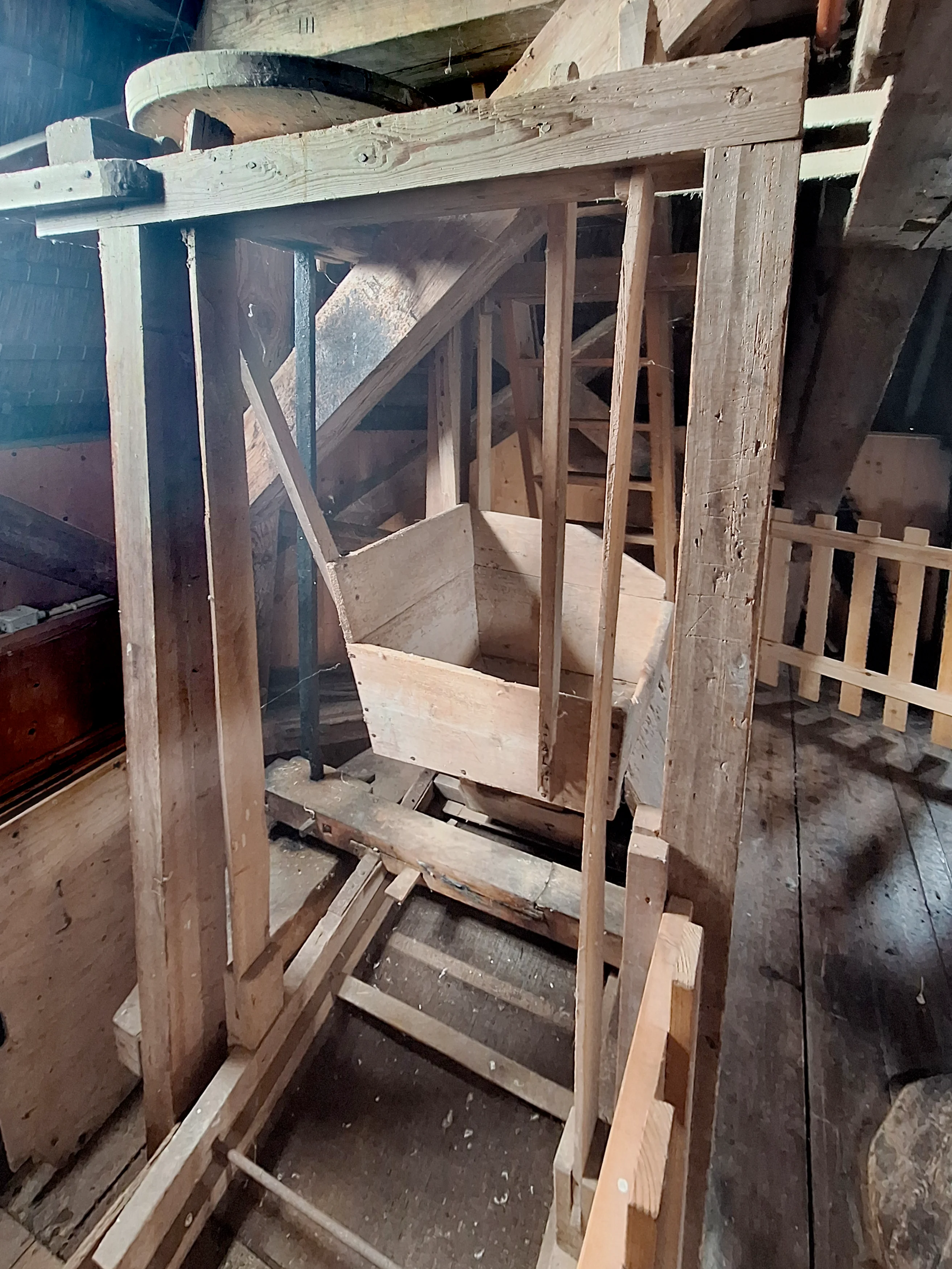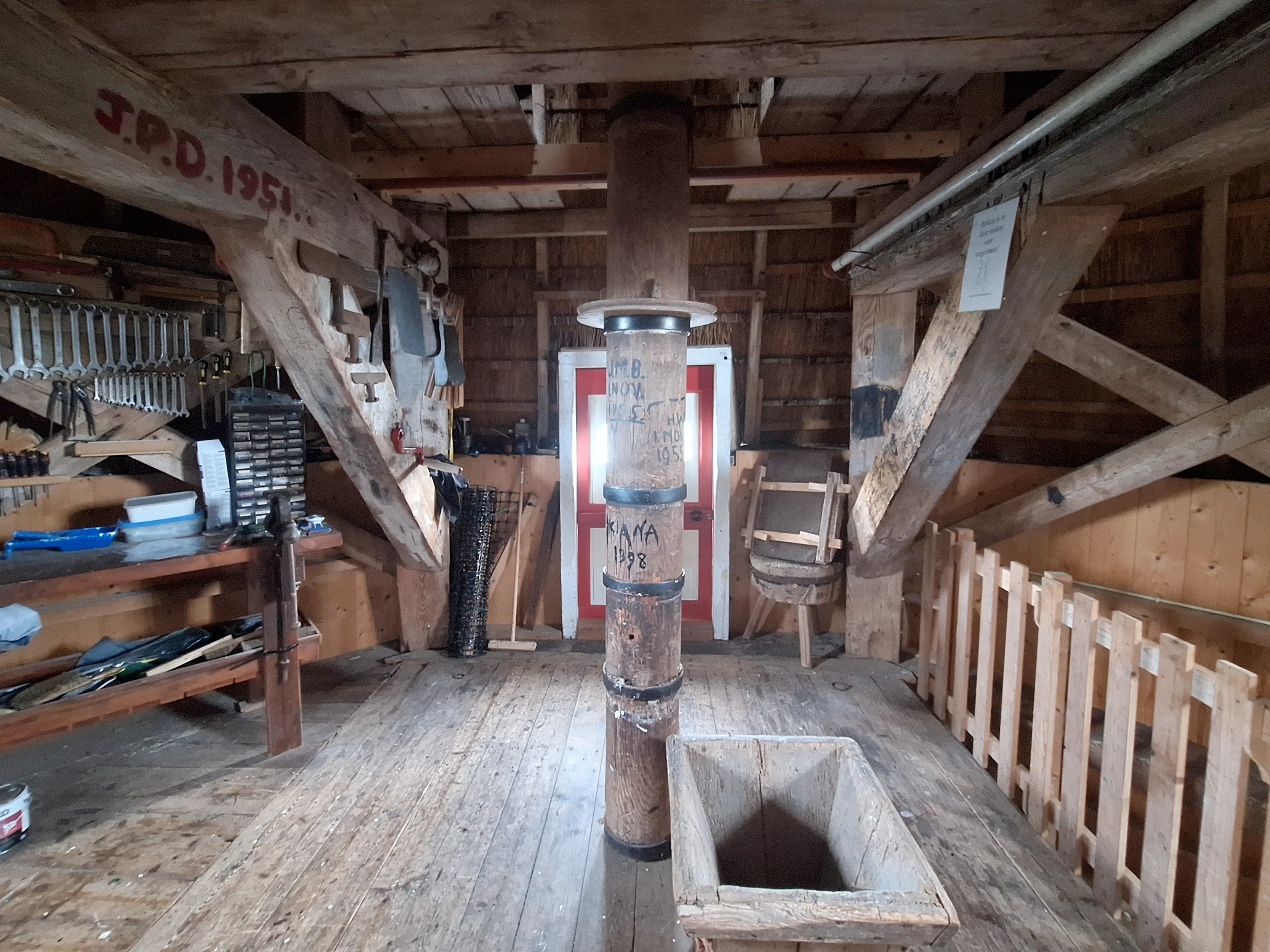 Een overzichtfoto van de stellingzolder met beide pelspillen en schudzeef.