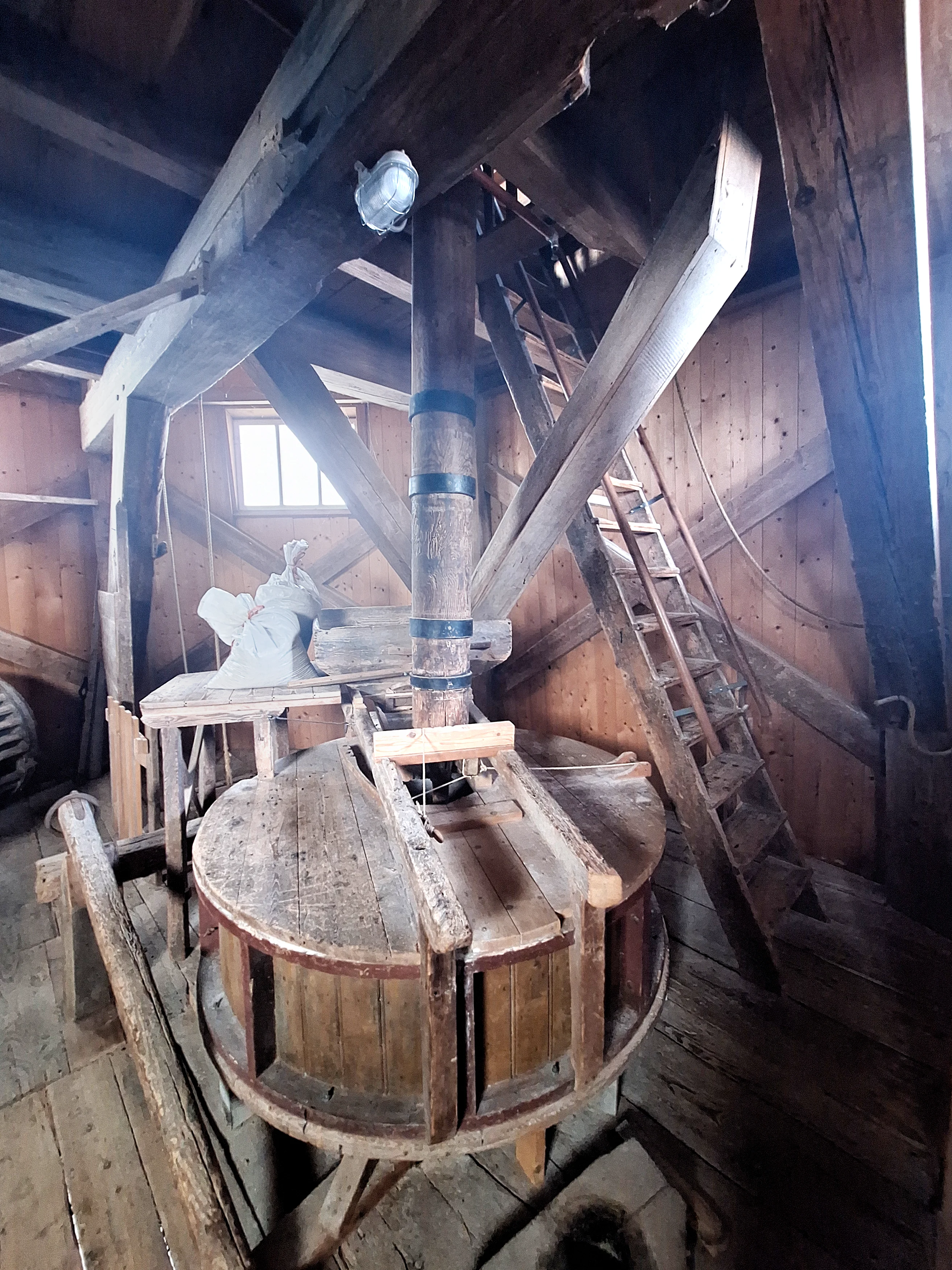 De begane grond tevens de maalzolder. Je komt binnen op een originele houten vloer.