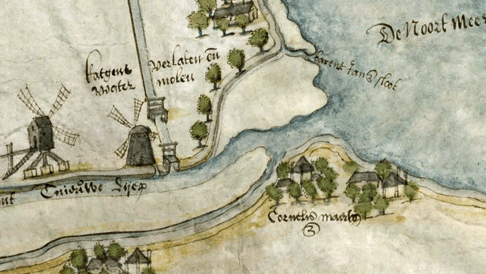 daarvan het Katgens-verlaat. Kaart door Jan Potter, 1567. Collectie Nationaal Archief, Den Haag. - nog waarneembaar