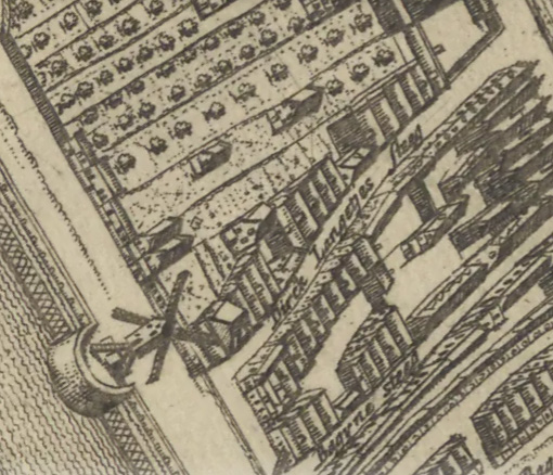 Molen 06904 i Gasthuijsmolen / Bordeelmolen / Het Bordeeltje (Delft), Delfi Batavorum vernacule Delft.1698|Amsteloda[mi] : F. de Wit excudit1:3 920 | Database Nederlandse molens
