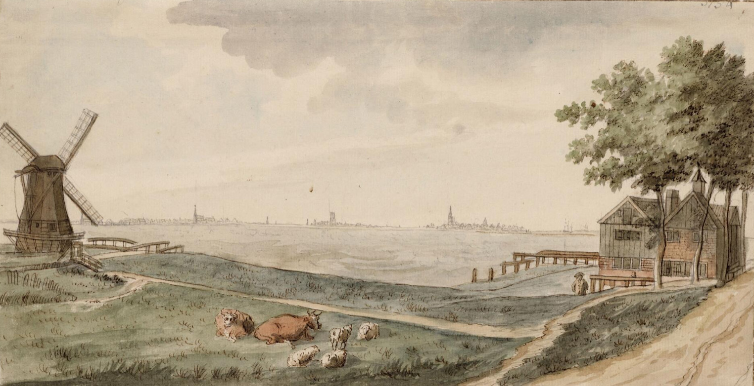 Molen 07188 Stadsvuilwatermolen (4) eerste locatie (Amsterdam)Herberg Zeeburg aan de Zeeburgerdijk. In het verschiet: Nieuwendam, Schellingwoude, Ransdorp, Durgerdam