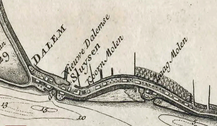 bouwjaar < 1729 verdwenen na 1729 molenaars geschiedenis Molen 07784 (zaagmolen) (Dalem) Detail van de kaart: De Rivier de Merwede, van ontrent de Steenen-hoek, Oostwaards-op tot verby het dorp van Sleeuwyk: met den Ouden-Wiel, en de Killen, die uit deselve na den Bies-Bos afloopen etc.1729|[Nicolaas Cruquius].