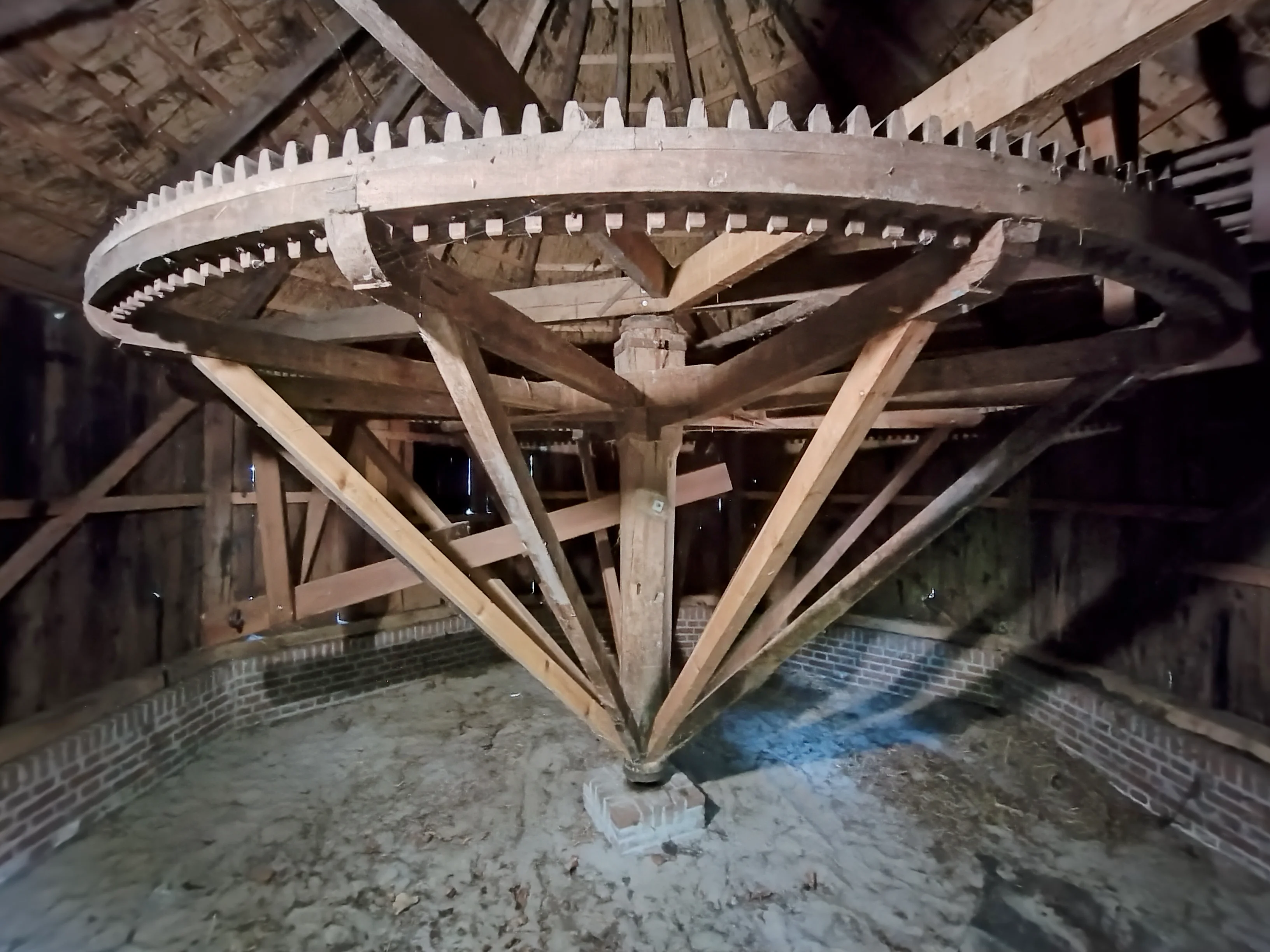 Tandwiel met aandrijfstang voor de aandrijving van werktuigen met behulp van de rosmolen.