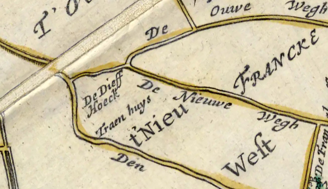 Molen 15222 De Kopermolen (Schiedam)kaartfragment van Floris Balthasar uit 1611 waarop De Dieffenhoek al staat ingetekend.